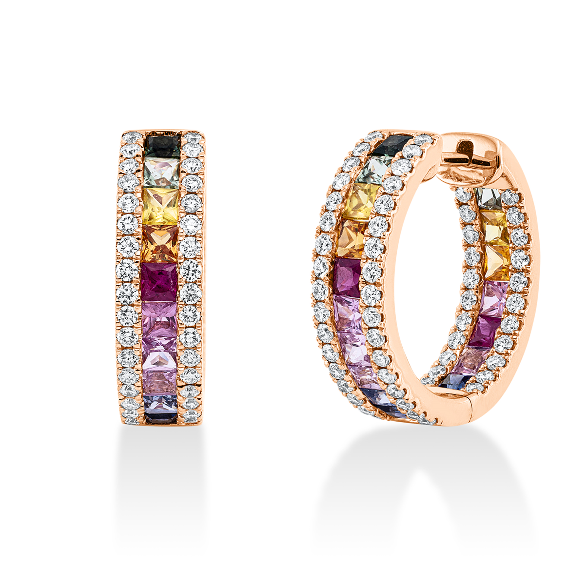 Creolen 18 kt RG, 112 Brillanten 1,01 ct, TW-si, 34 Saphire 3,38 ct multicolor, H:19,1 mm, B:19,1 mm, S:5,5 mm