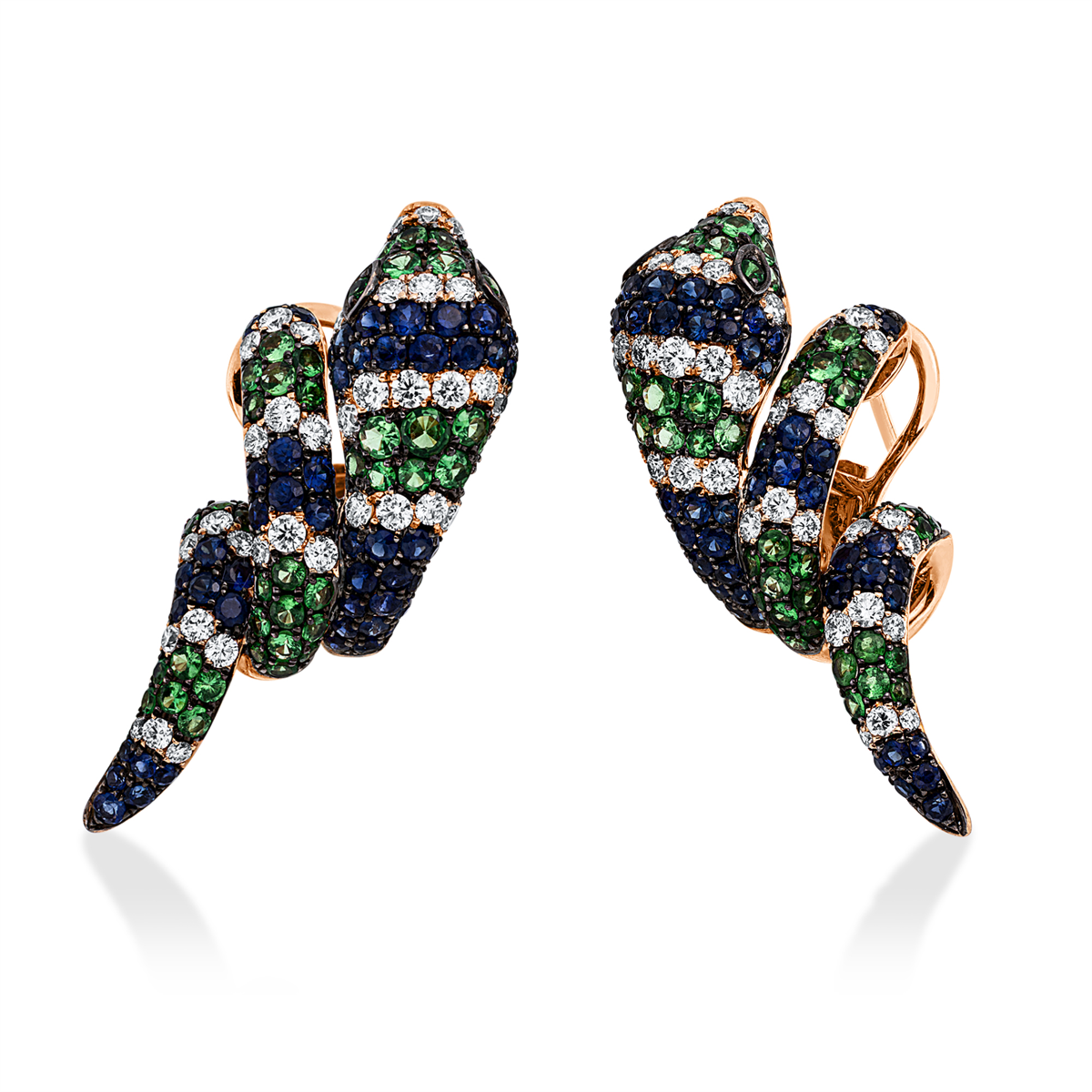 Creolen 18 kt RG Schlange, Fassung schwarz rhodiniert, 74 Brillanten 1,34 ct, TW-vsi/si, 106 Saphire 1,94 ct blau, 94 Tsavorith 1,90 ct grün