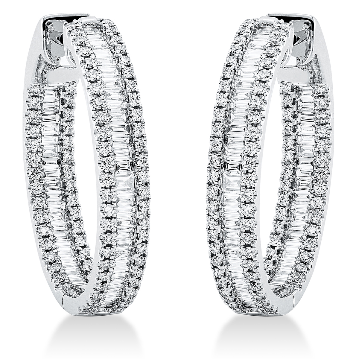 Creolen 18 kt WG, 104 Baguette 1,26 ct, TW-si, 164 Brillanten 0,78 ct, TW-si, H:25,7 mm, B:21,8 mm, S:4,4 mm