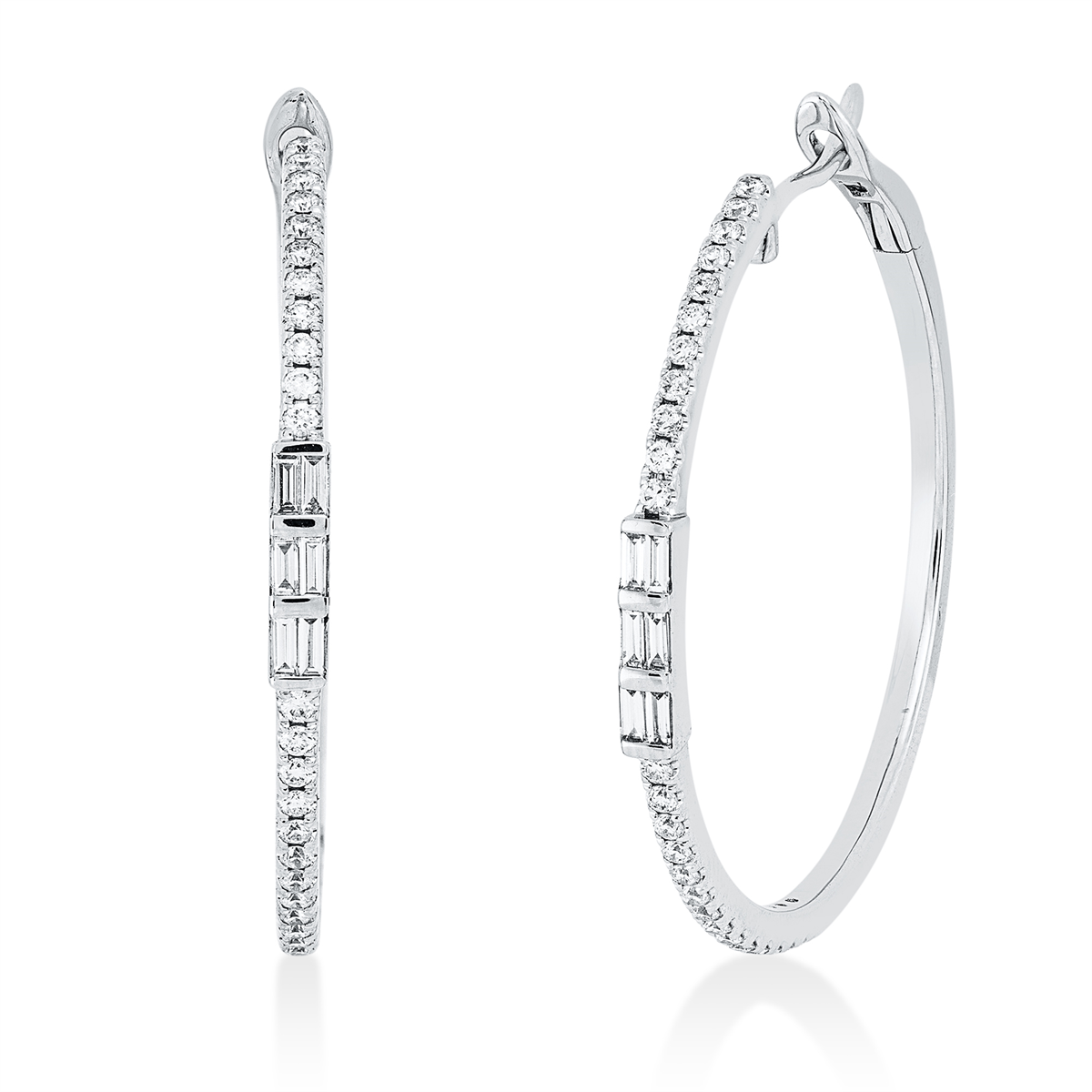 Creolen 18 kt WG, 12 Baguette 0,19 ct, TW-si, 50 Brillanten 0,41 ct, TW-si, H:33,1 mm, B:33,1 mm, S:2,3 mm