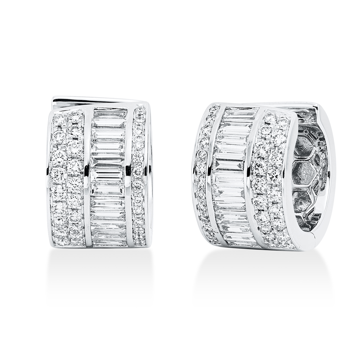 Creolen 18 kt WG, 24 Baguette 1,12 ct, TW-vsi, 64 Brillanten 0,60 ct, TW-vsi, H:14,6 mm, B:15,3 mm, S:9,8 mm