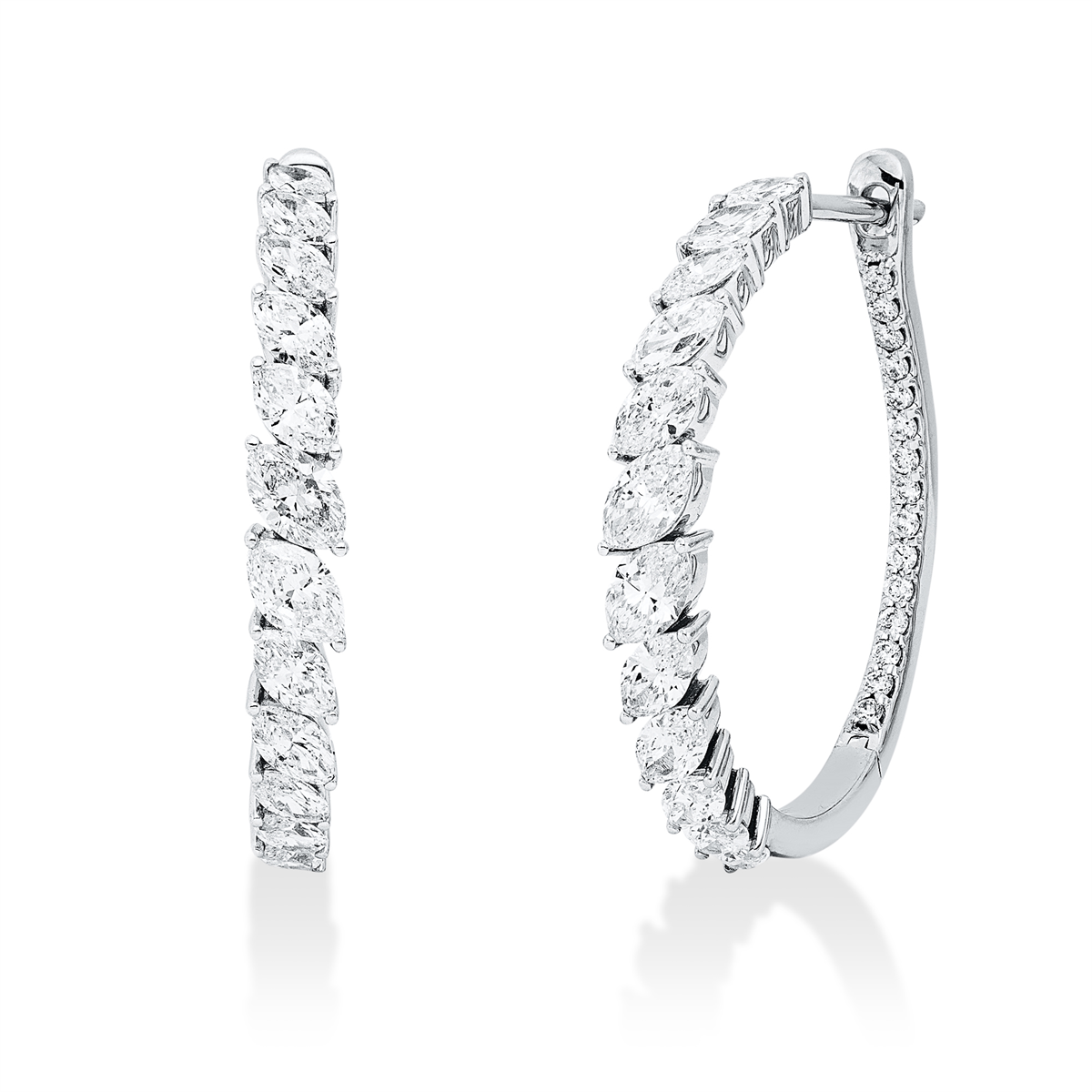 Creolen 18 kt WG, 20 Navette 1,27 ct, TW-si, 4 Navette 0,54 ct, TW-si, 30 Brillanten 0,19 ct, TW-si, H:25,1 mm, B:22,0 mm, S:3,5 mm