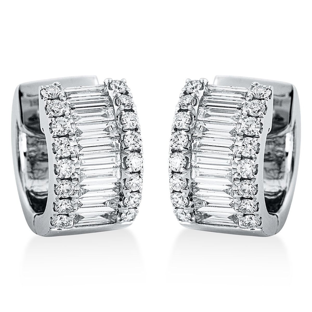 Creolen 18 kt WG, 17 Baguette 0,79 ct, TW-vsi, 32 Brillanten 0,39 ct, TW-vsi, H:12,0 mm, B:13,3 mm, S:6,9 mm