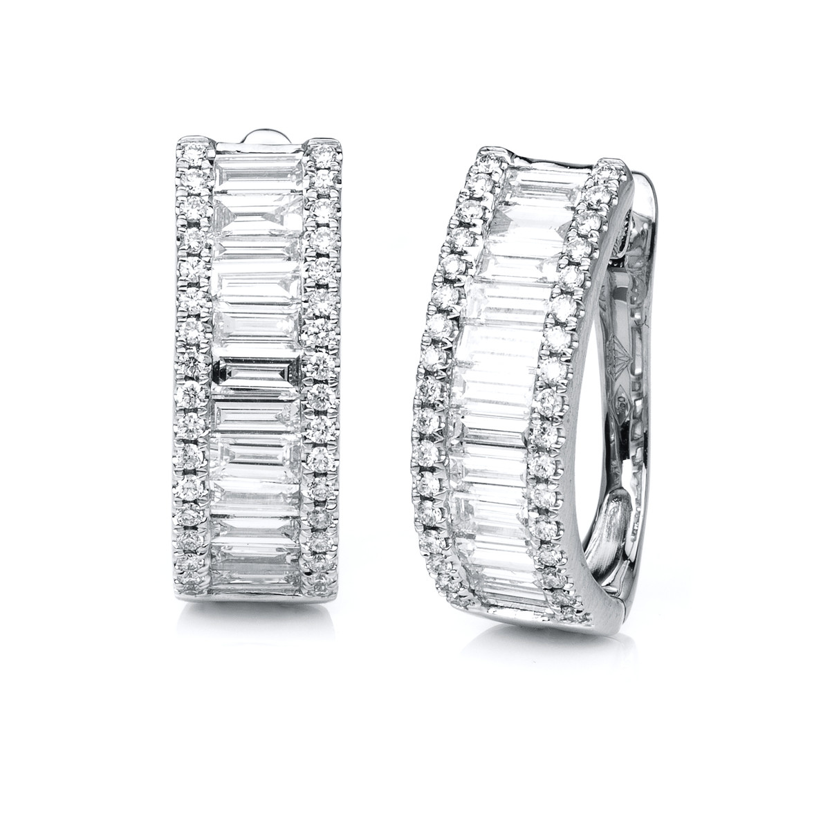 Creolen 18 kt WG, 20 Baguette 1,94 ct, TW-si, 68 Brillanten 0,42 ct, TW-si, H:18,2 mm, B:12,8 mm, S:6,5 mm