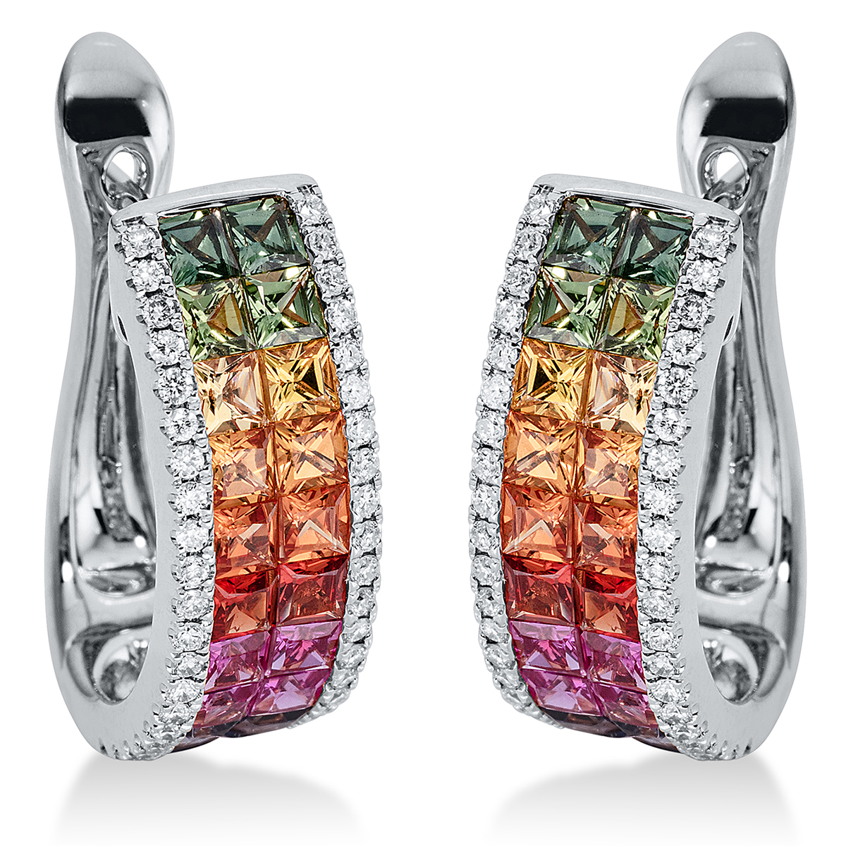 Creolen 18 kt WG, 80 Brillanten 0,32 ct, TW-si, 40 Saphire 2,80 ct fancy, H:20,3 mm, B:14,7 mm, S:6,8 mm