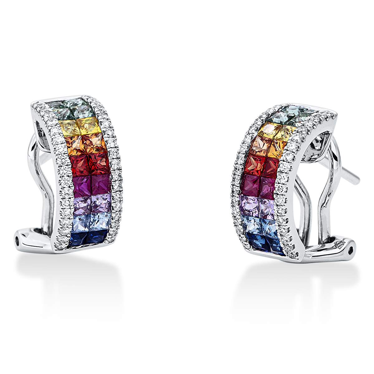 Creolen 18 kt WG, 72 Brillanten 0,27 ct, TW-si, 36 Saphire 1,91 ct multicolor, H:12,3 mm, B:6,5 mm, S:4,2 mm