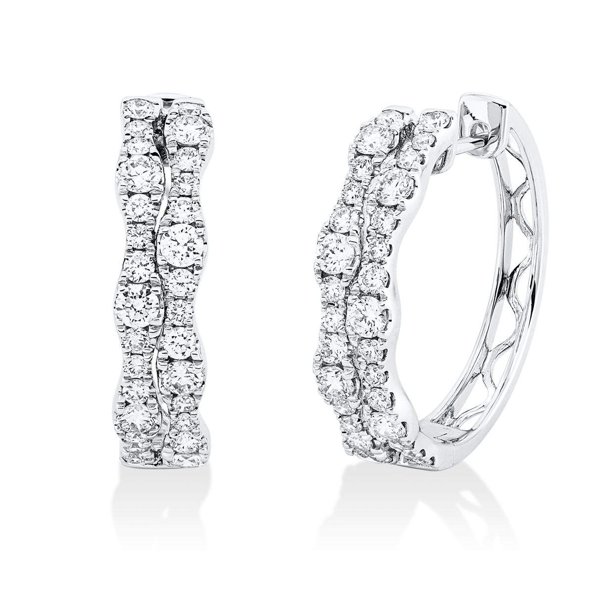 Creolen 18 kt WG, 14 Brillanten 0,69 ct, TW-si, 44 Brillanten 0,65 ct, TW-si, H:20,8 mm, B:21,5 mm, S:5,2 mm