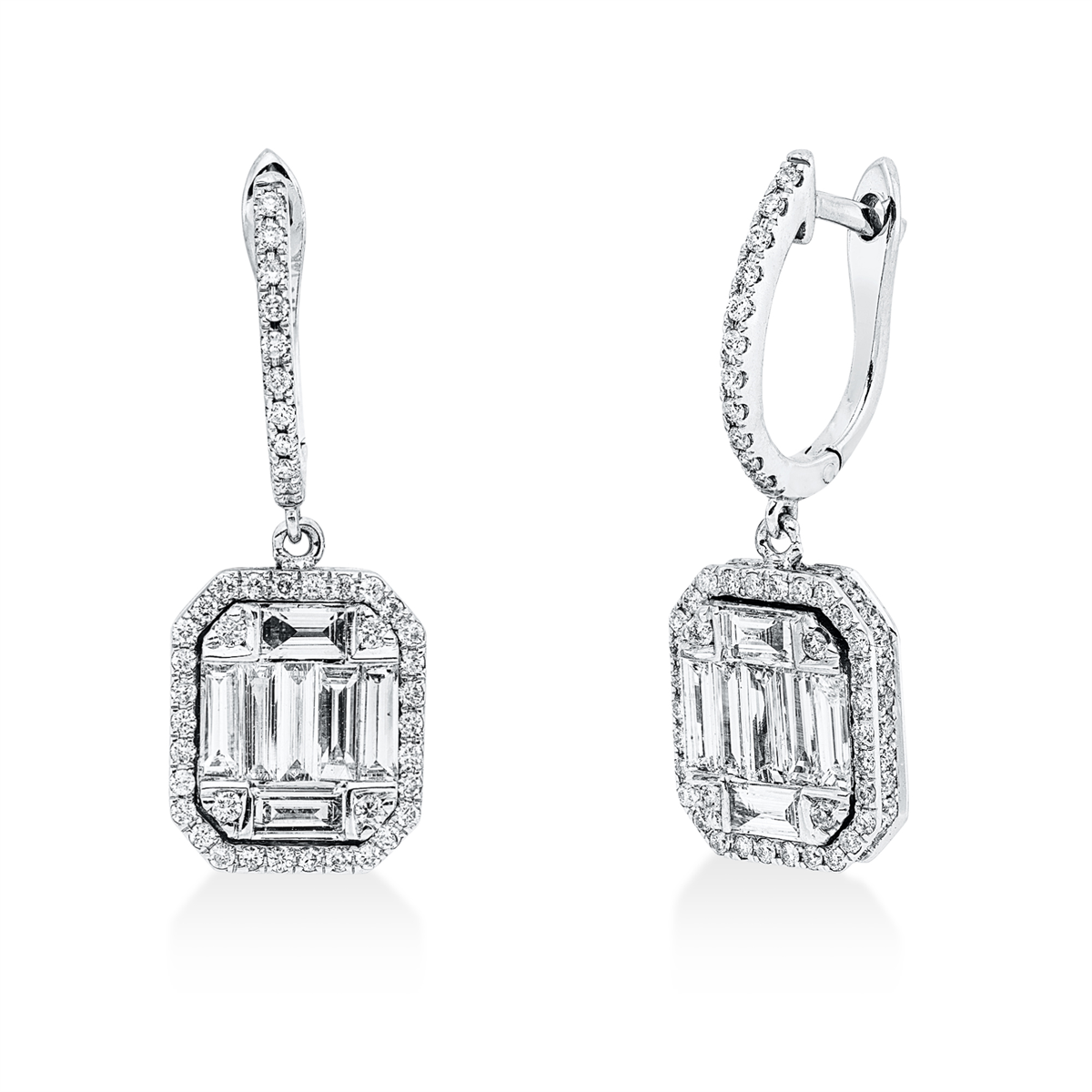 Ohrschmuck 14 kt WG, 12 Baguette 0,77 ct, F-vsi, 2 Baguette 0,16 ct, F-vsi, 152 Brillanten 0,63 ct, F-si, H:26,9 mm, B:9,4 mm, S:2,5 mm