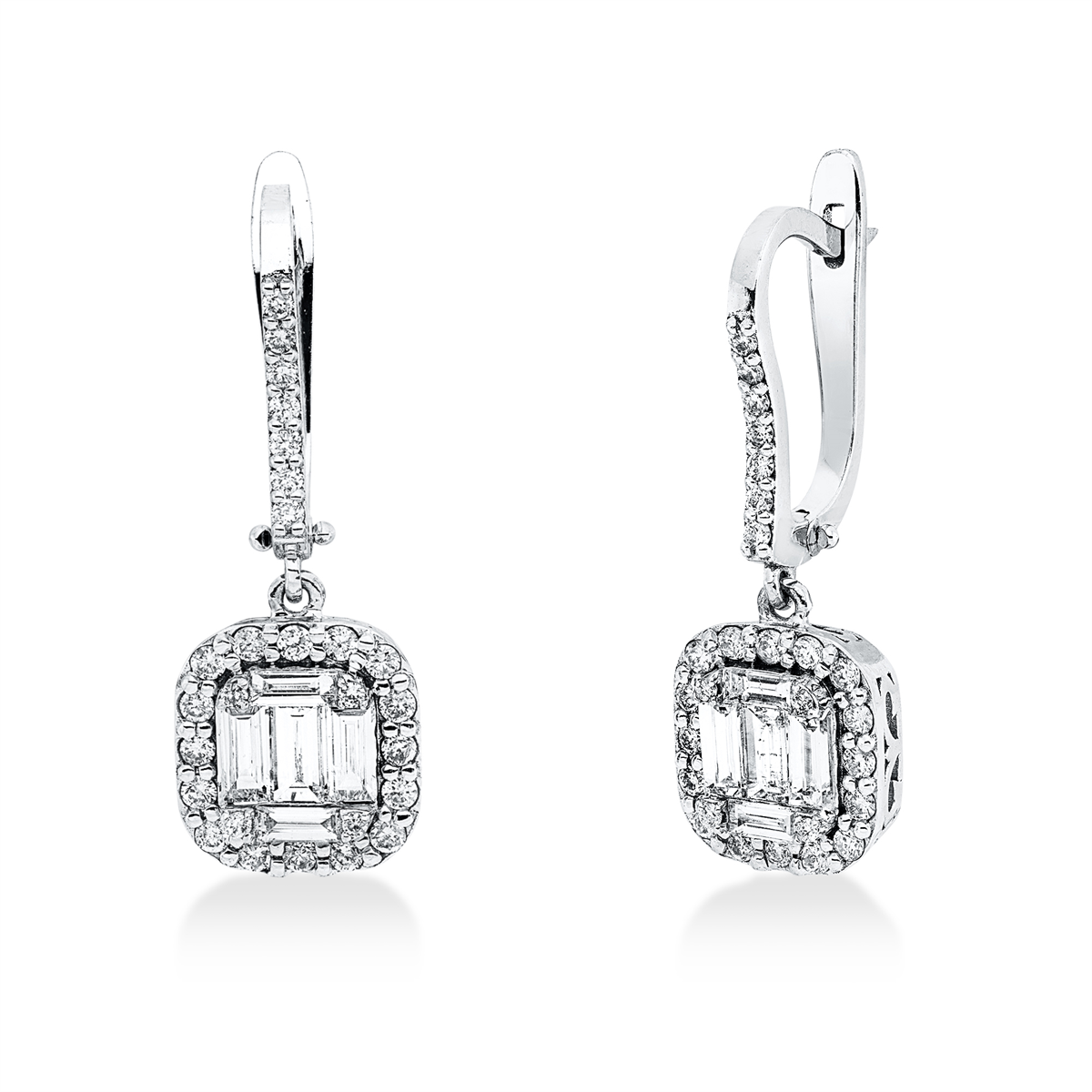 Ohrschmuck 14 kt WG, 4 Baguette 0,18 ct, F-vsi, 6 Baguette 0,66 ct, F-vsi, 54 Brillanten 0,49 ct, F-si, H:27,8 mm, B:7,6 mm, S:4,4 mm