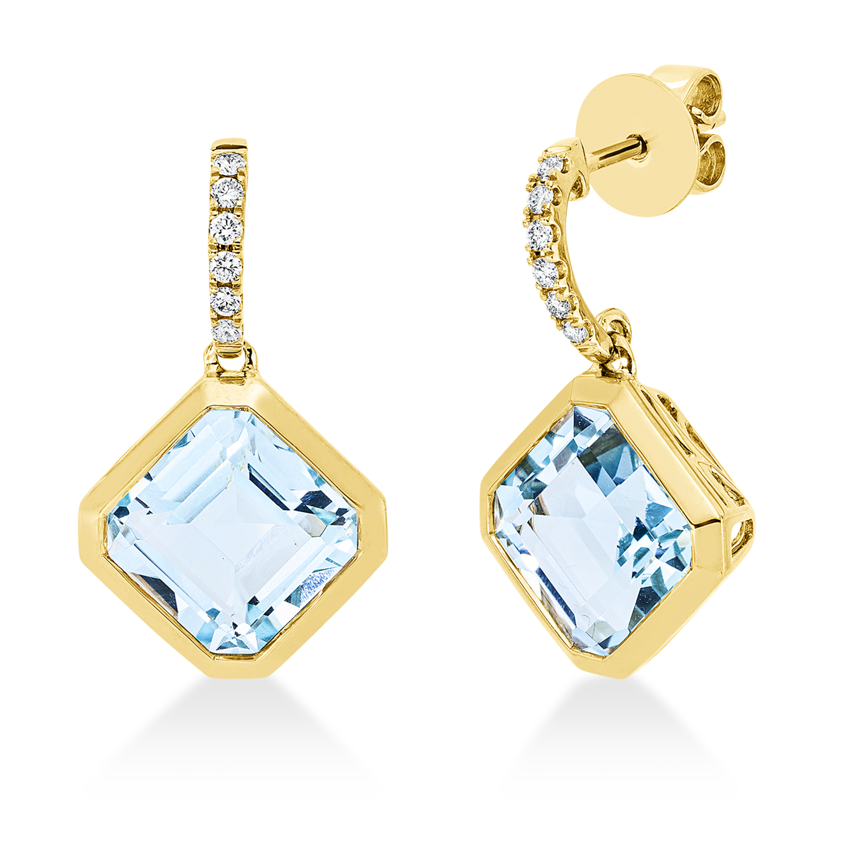 Ohrschmuck 18 kt GG, 12 Brillanten 0,15 ct, TW-si, 2 Topase 9,00 ct sky blue