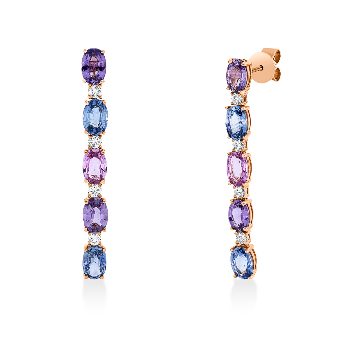 Ohrschmuck 18 kt RG, 8 Brillanten 0,36 ct, TW-si, 2 Saphire 1,08 ct pink, 4 Saphire 2,47 ct blau, 4 Saphire 2,02 ct lila