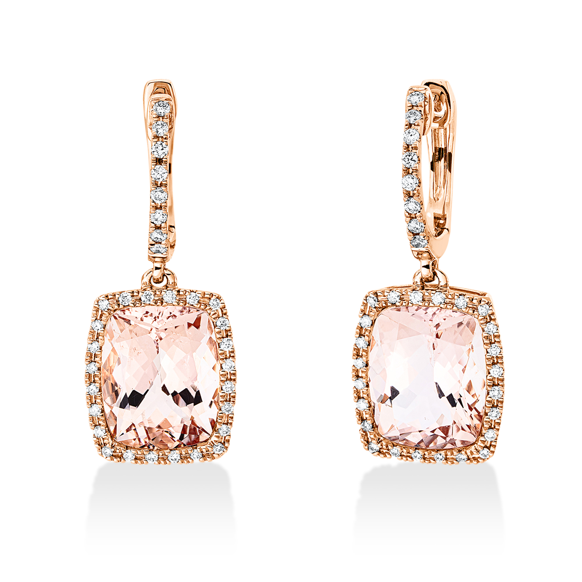 Ohrschmuck 18 kt RG, 64 Brillanten 0,30 ct, TW-si, 2 Morganit 6,00 ct pink, H:24,5 mm, B:10,0 mm, S:4,6 mm