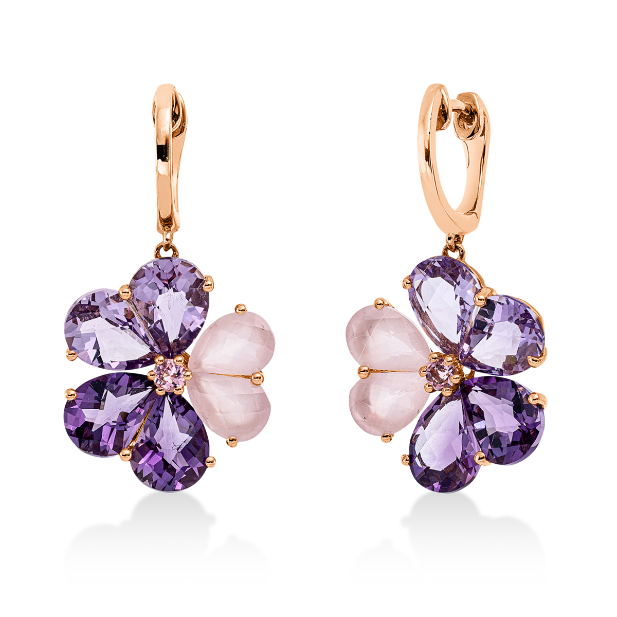 Ohrschmuck 18 kt RG, 4 Rosenquarz 2,40 ct rosé, 4 Amethyste 3,70 ct pink, 4 Amethyste 3,60 ct lila, 2 Turmalin 0,20 ct pink, H:29,9 mm, B:15,8 mm, S:3,8 mm