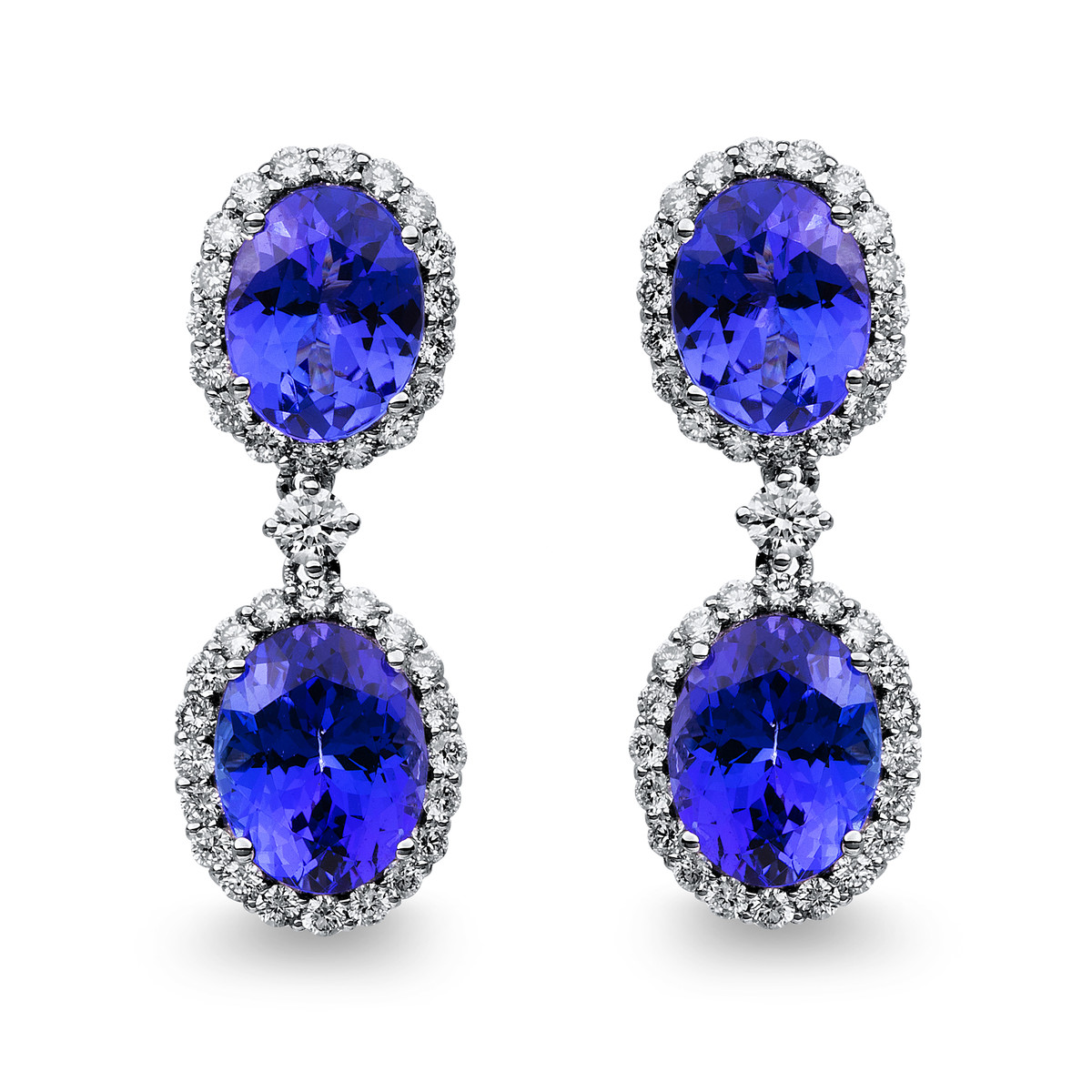 Ohrschmuck 18 kt WG, 78 Brillanten 1,27 ct, TW-si, 4 Tansanit 8,60 ct blau, H:27,1 mm, B:10,2 mm