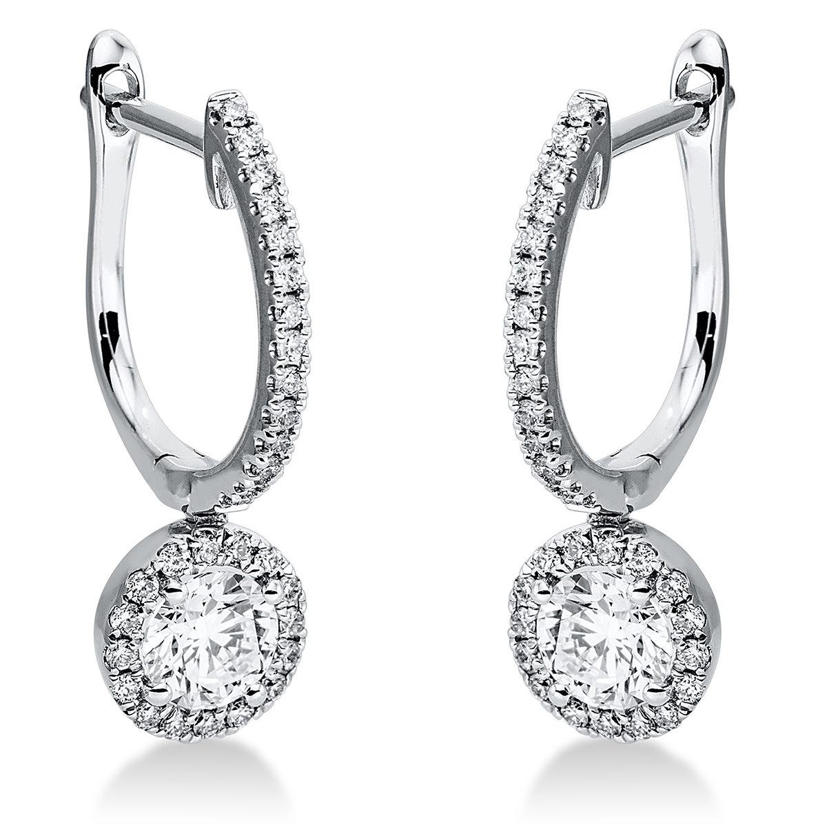 Ohrschmuck 18 kt WG, 2 Brillanten 0,66 ct, TW-si, 60 Brillanten 0,20 ct, TW-si, H:18,0 mm, B:6,0 mm, S:2,3 mm
