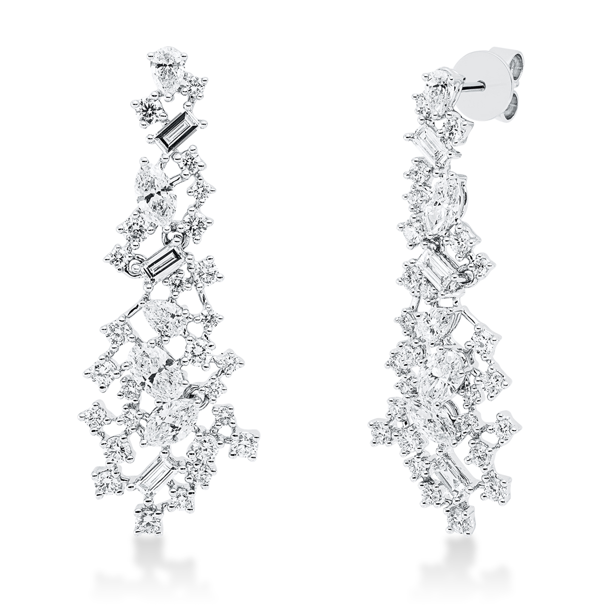 Ohrschmuck 18 kt WG, 6 Baguette 0,37 ct, TW-si, 4 Navette 0,62 ct, TW-si, 4 Tropfen 0,33 ct, TW-si, 2 Oval 0,43 ct, TW-si, 52 Brillanten 1,06 ct, TW-si, H:36,2 mm, B:13,4 mm, S:2,7 mm