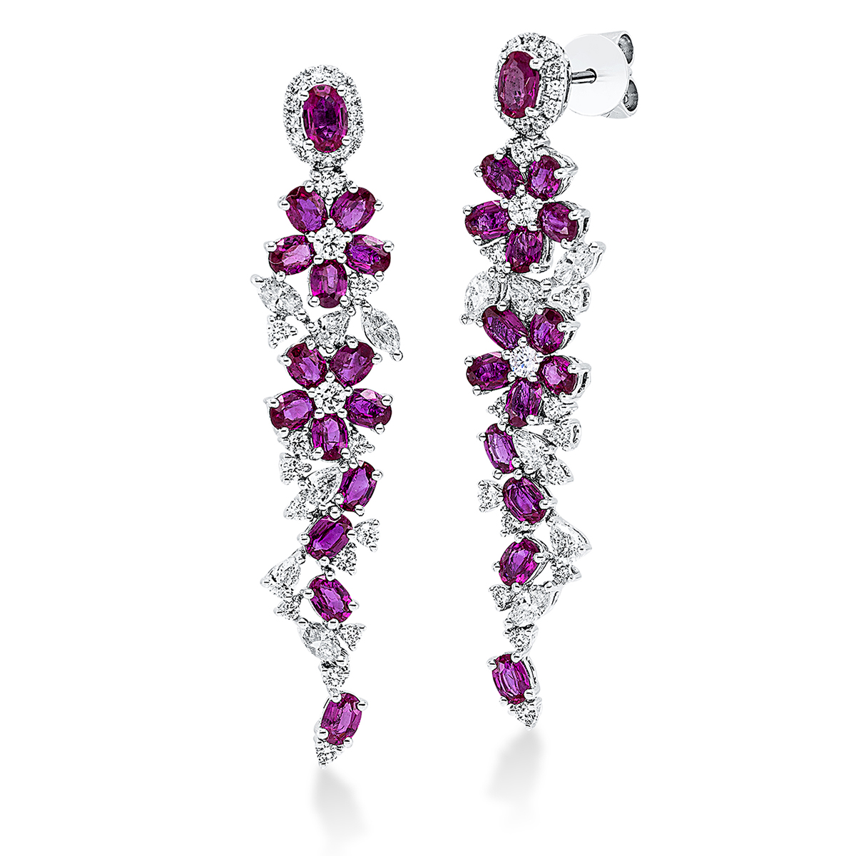 Ohrschmuck 18 kt WG, 6 Tropfen 0,31 ct, TW-si, 6 Navette 0,42 ct, TW-si, 54 Brillanten 0,61 ct, TW-si, 30 Rubine 3,94 ct rot, H:46,1 mm, B:9,5 mm, S:3,5 mm