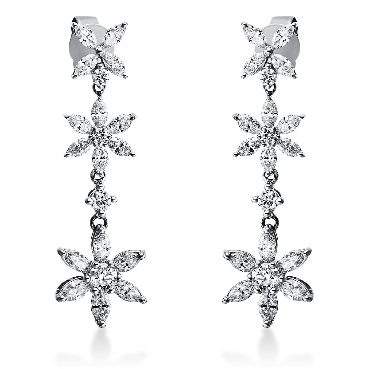 Ohrschmuck 18 kt WG, 6 Brillanten 0,24 ct, TW-si, 32 Navette 1,91 ct, TW-si, 2 Brillanten 0,29 ct, TW-si, H:35,0 mm, B:10,6 mm, S:3,5 mm