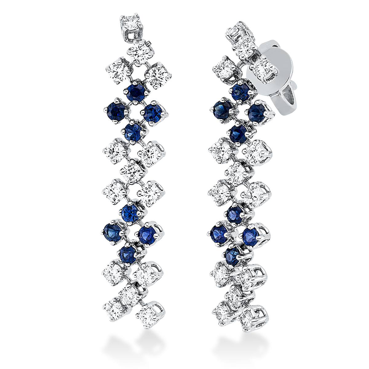 Ohrschmuck 18 kt WG, 24 Brillanten 0,74 ct, TW-si, 16 Saphire 0,50 ct blau, H:28,4 mm, B:5,7 mm, S:2,2 mm