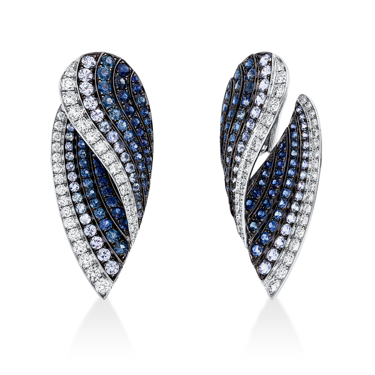 Ohrschmuck 18 kt WG, Fassung teils schwarz rhodinie, 68 Brillanten 2,68 ct, TW-vsi/si, 174 Saphire 8,12 ct blau