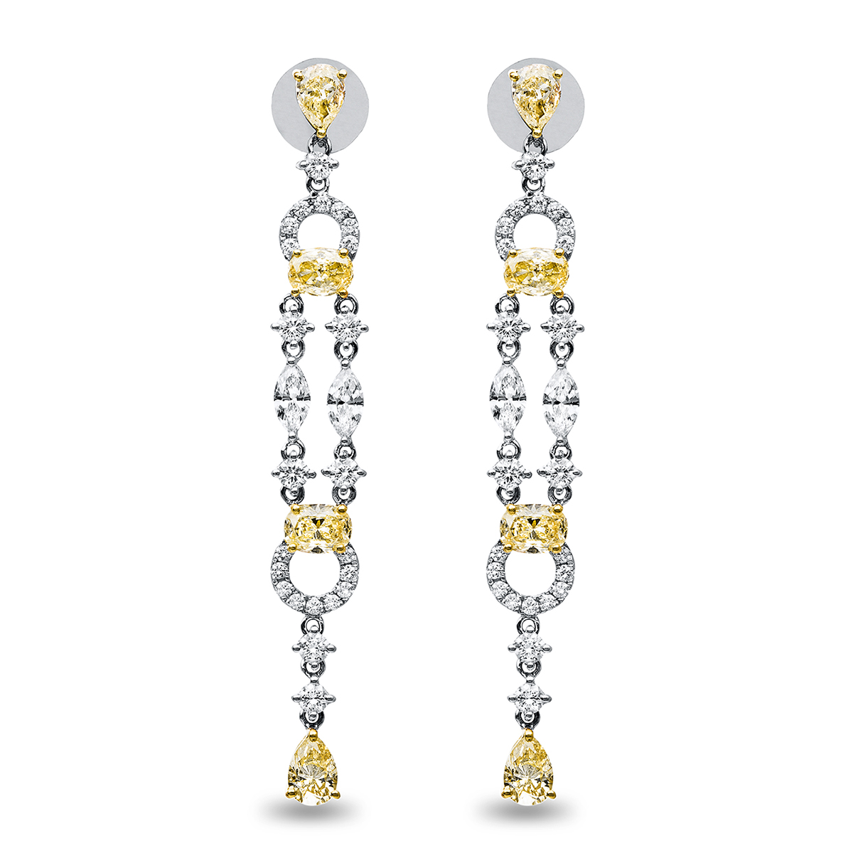 Ohrschmuck 18 kt WG+GG, 4 Navette 0,75 ct, TW-vsi/si, 46 Brillanten 1,14 ct, TW-vsi/si, 8 Brillanten 3,17 ct, gelb, H:60,8 mm, B:7,2 mm