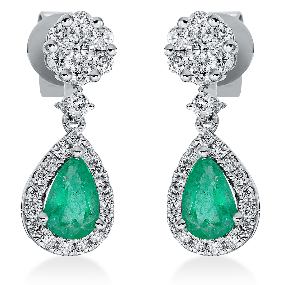 Ohrschmuck 3er-Krappe 18 kt WG Tropfen, 2 Brillanten 0,09 ct, TW-si, 46 Brillanten 0,50 ct, TW-si, 2 Smaragde 0,71 ct grün