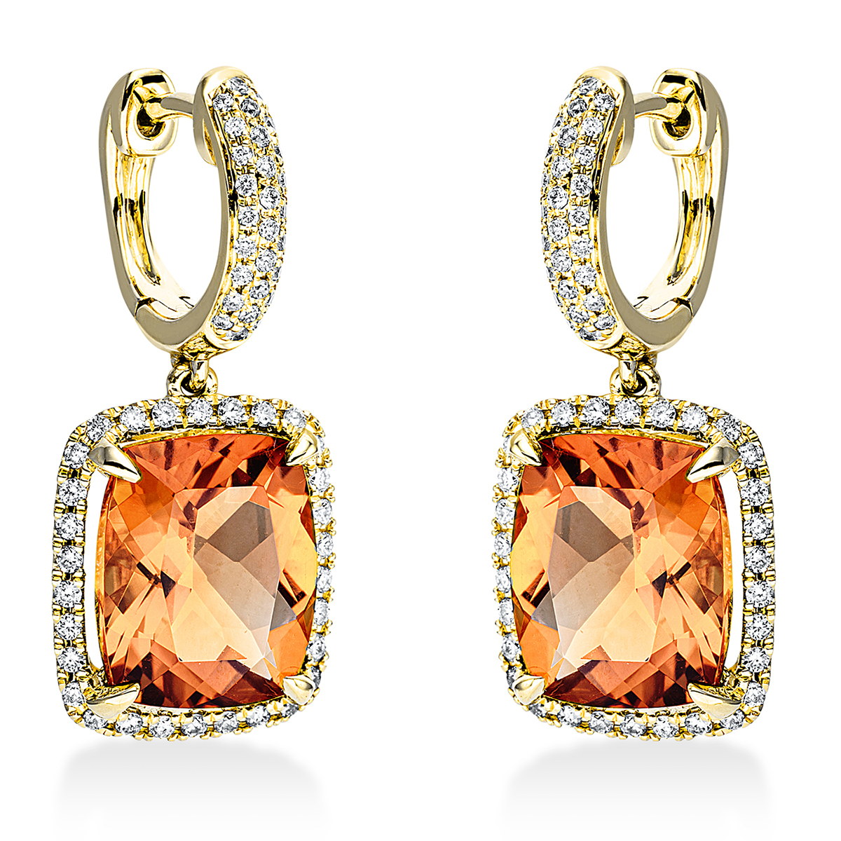 Ohrschmuck 4er-Krappe 18 kt GG, 116 Brillanten 0,51 ct, TW-si, 2 Citrin 6,80 ct mandarin, H:26,0 mm, B:11,4 mm, S:6,2 mm