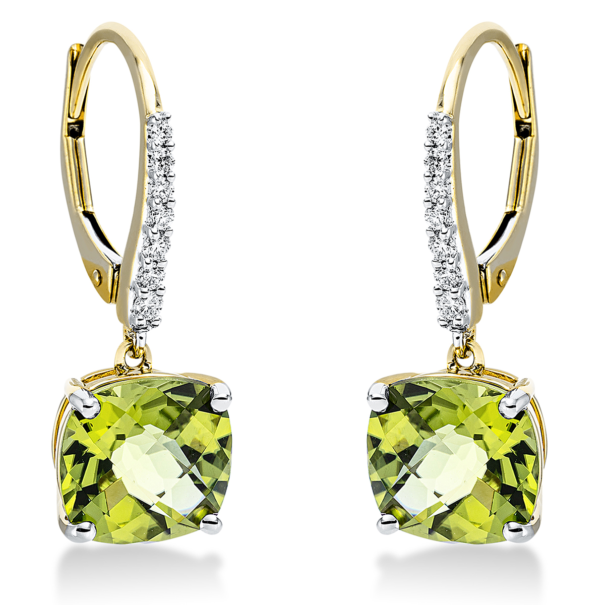 Ohrschmuck 4er-Krappe 18 kt GG, Fassung rhodiniert, 14 Brillanten 0,14 ct, TW-si, 2 Peridot 4,01 ct grün, H:23,8 mm, B:8,0 mm, S:6,2 mm