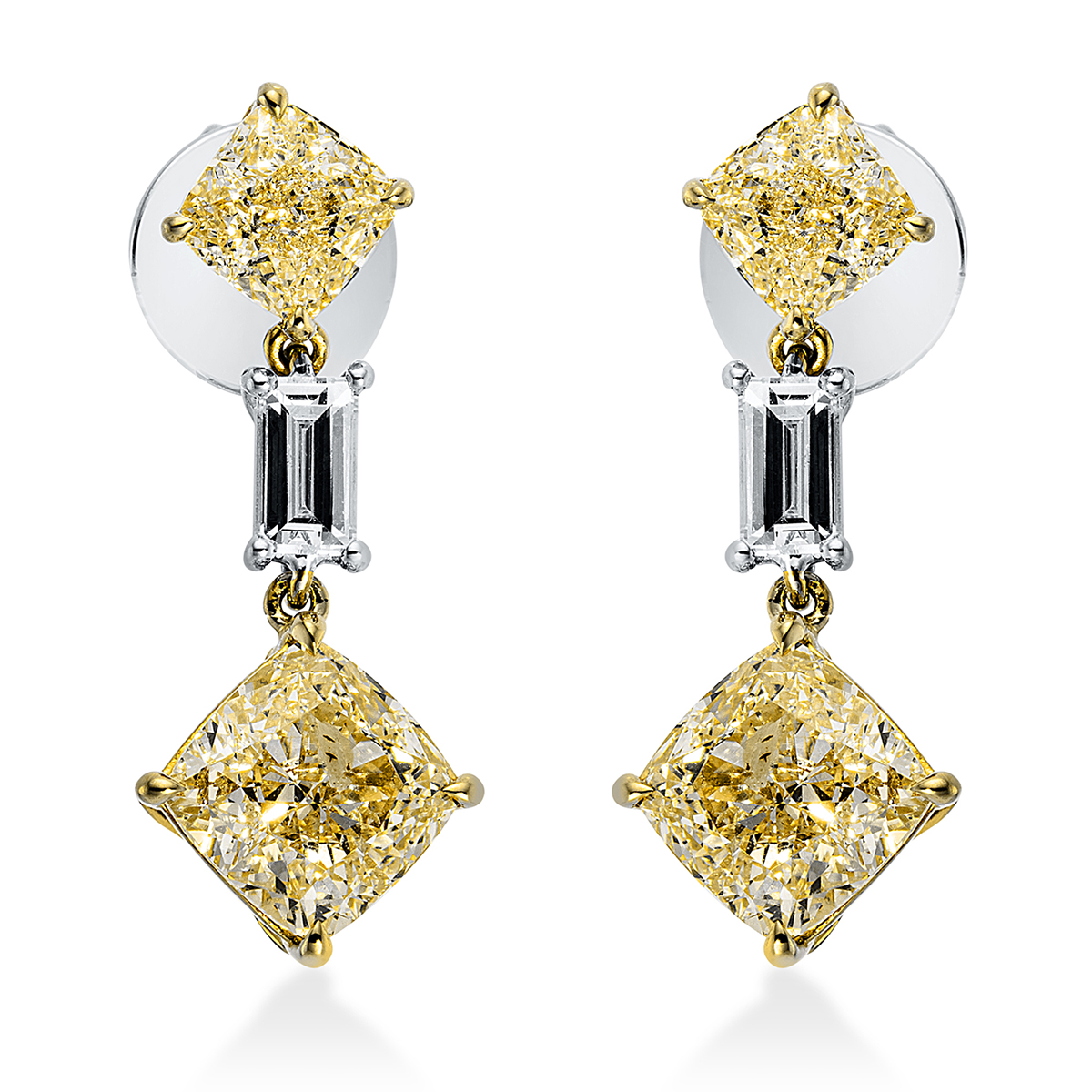 Ohrschmuck 4er-Krappe 18 kt GG+WG, GIA 4 pcs, 2 Cushion 1,81 ct, gelb-i1, 2 Cushion 4,19 ct, gelb-si2, 2 Baguette 0,46 ct, TW-vsi