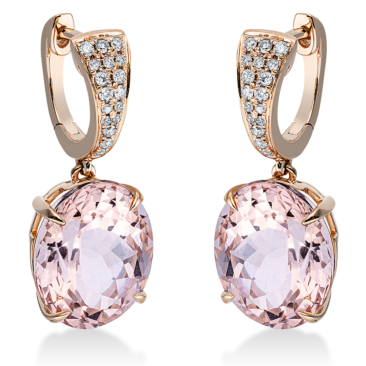Ohrschmuck 4er-Krappe 18 kt RG, 34 Brillanten 0,17 ct, TW-si, 2 Morganit 9,80 ct pink, H:24,3 mm, B:10,1 mm