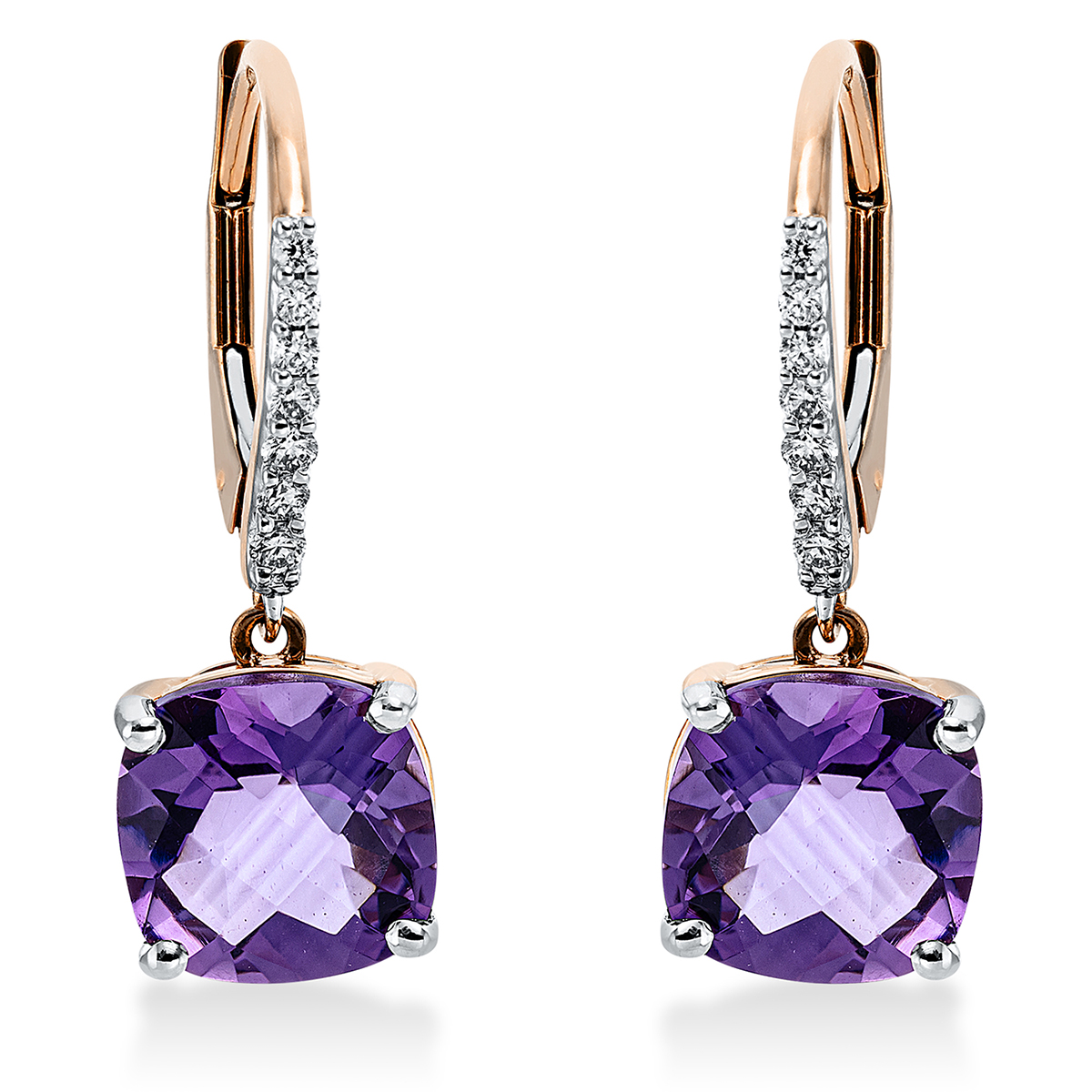 Ohrschmuck 4er-Krappe 18 kt RG, Fassung rhodiniert, 14 Brillanten 0,13 ct, TW-si, 2 Amethyste 3,86 ct lila