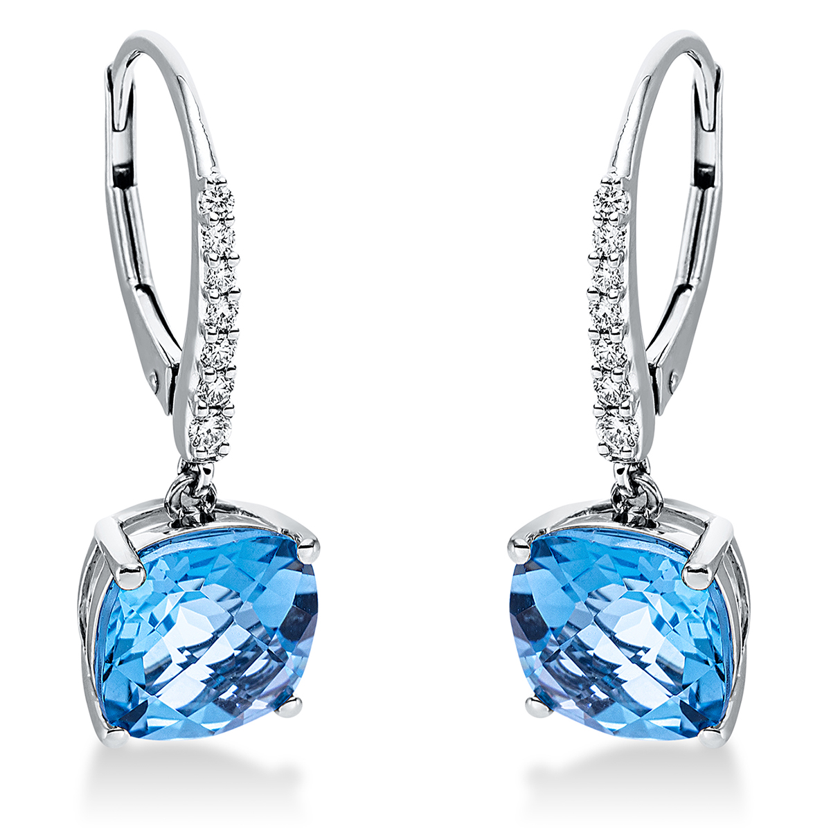 Ohrschmuck 4er-Krappe 18 kt WG, 14 Brillanten 0,14 ct, TW-si, 2 Topase 5,68 ct blau