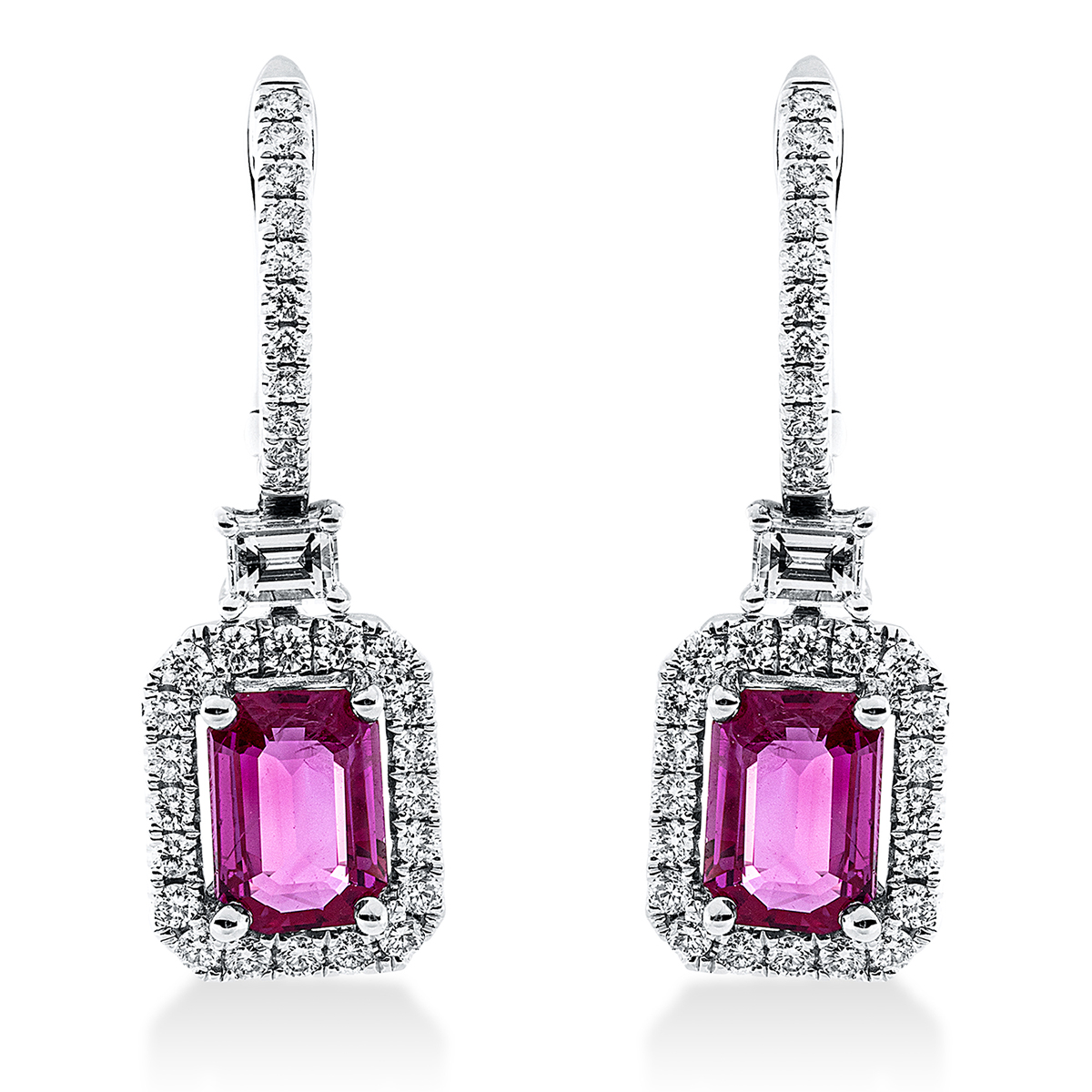 Ohrschmuck 4er-Krappe 18 kt WG, 2 Baguette 0,23 ct, TW-vsi, 62 Brillanten 0,47 ct, TW-si, 2 Rubine 2,00 ct rot, H:25,5 mm, B:8,5 mm