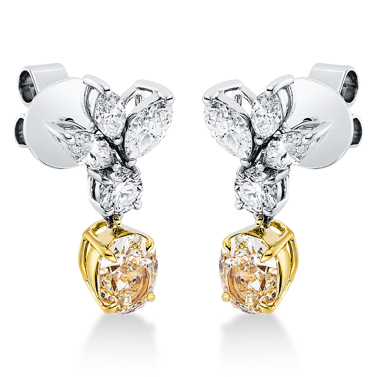 Ohrschmuck 4er-Krappe 18 kt WG+GG, GIA 2pcs, 6 Navette 0,73 ct, TW-vvs, 1 Oval 0,66 ct, gelb-si2, 1 Oval 0,66 ct, gelb-si1, 2 Brillanten 0,26 ct, TW-si