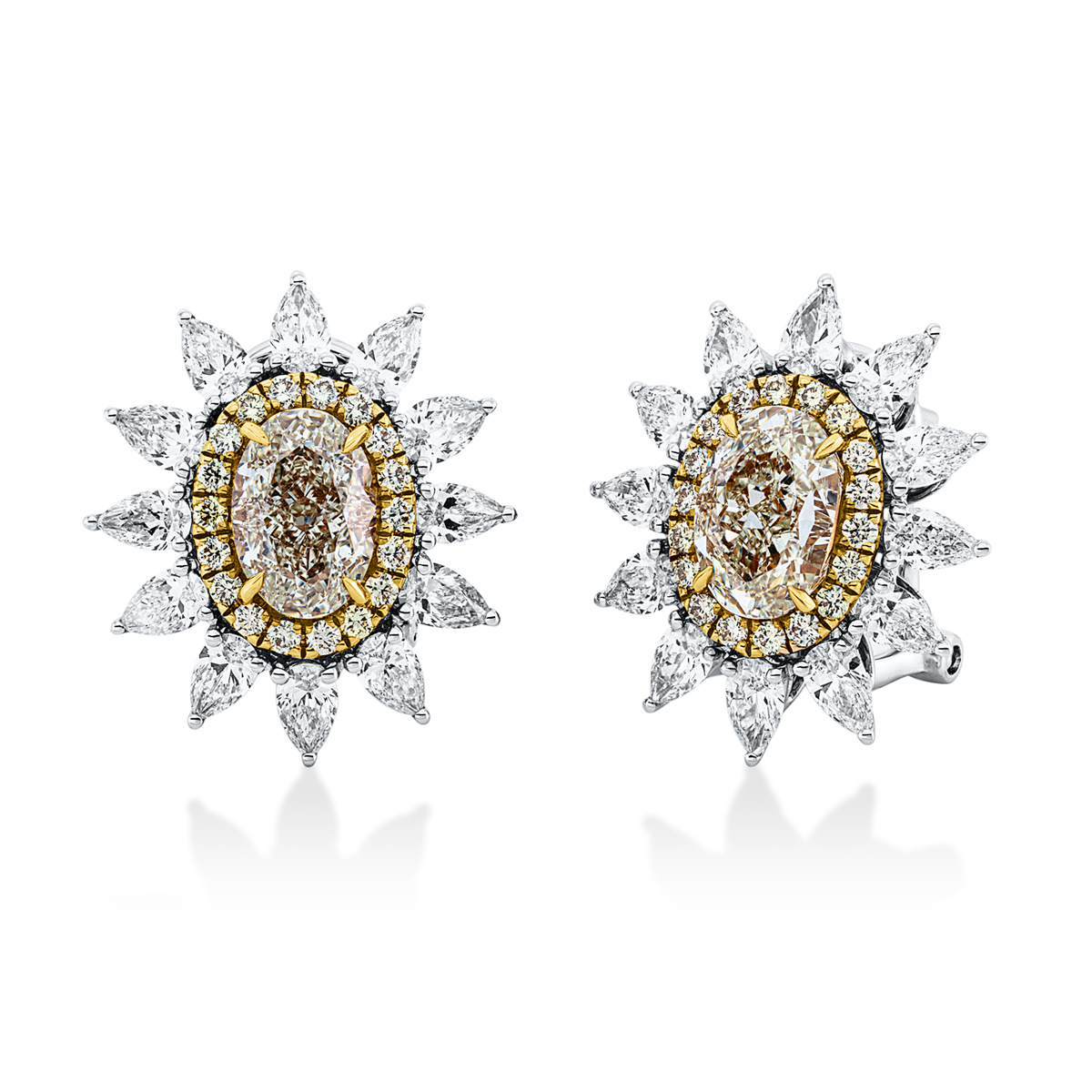 Ohrschmuck 4er-Krappe 18 kt WG+GG, GIA 2pcs, 24 Tropfen 2,08 ct, F-vsi, 2 Oval 3,26 ct, gelb-vs1, 36 Brillanten 0,37 ct, gelb, H:19,5 mm, B:16,4 mm, S:7,4 mm