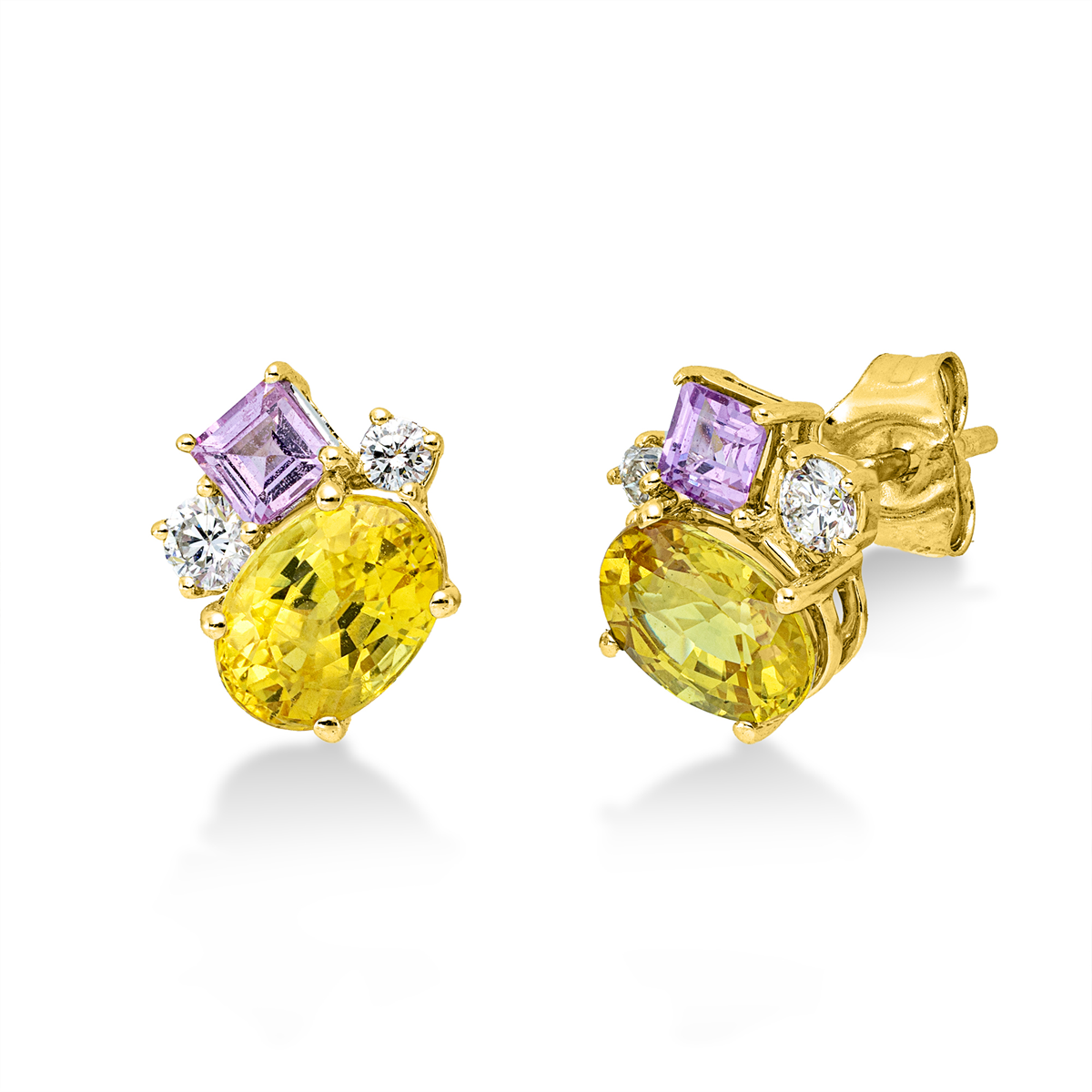 Ohrstecker 18 kt GG, 2 Brillanten 0,13 ct, TW-si, 2 Brillanten 0,06 ct, TW-si, 2 Saphire 1,94 ct gelb, 2 Saphire 0,37 ct pink, H:8,5 mm, B:8,2 mm
