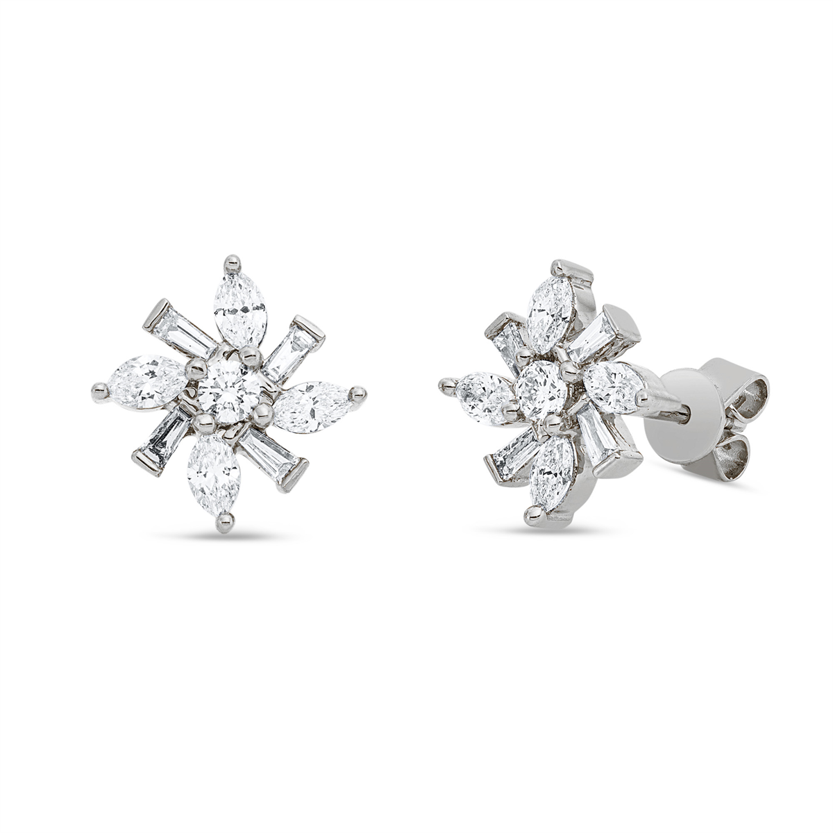 Ohrstecker 18 kt GG, 8 Navette 0,46 ct, TW-vsi, 8 Trapeze 0,15 ct, TW-vsi, 2 Brillanten 0,12 ct, TW-si, H:10,9 mm, B:10,9 mm, S:2,6 mm