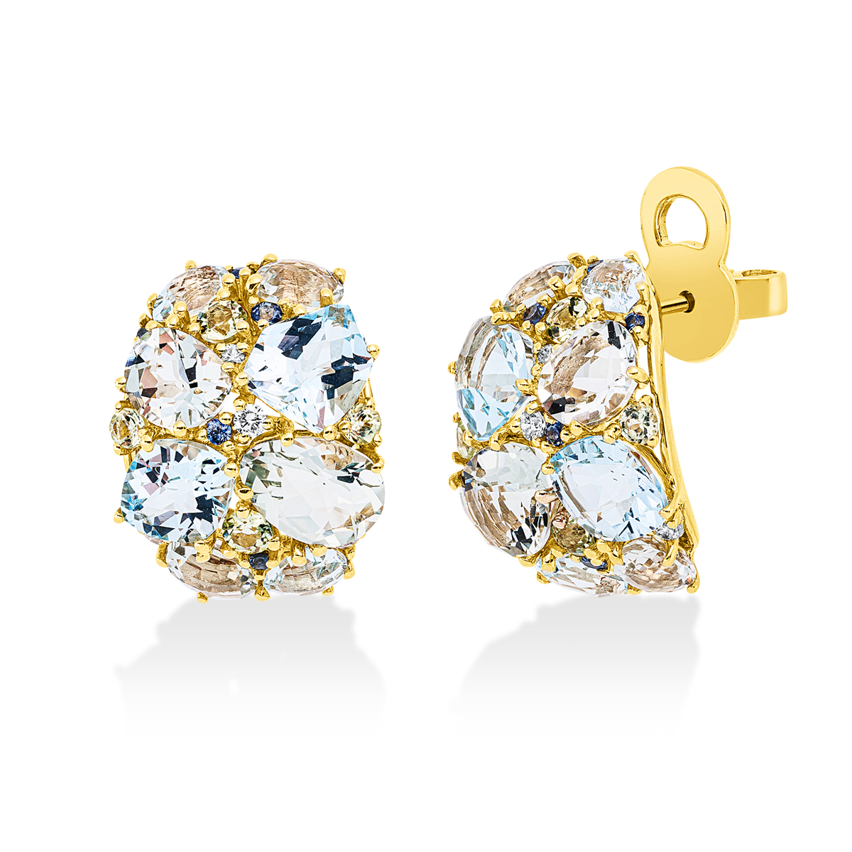 Ohrstecker 18 kt GG, 8 Brillanten 0,14 ct, TW-si, 24 Farbsteine 10,30 ct multicolor, 10 Saphire 0,18 ct blau