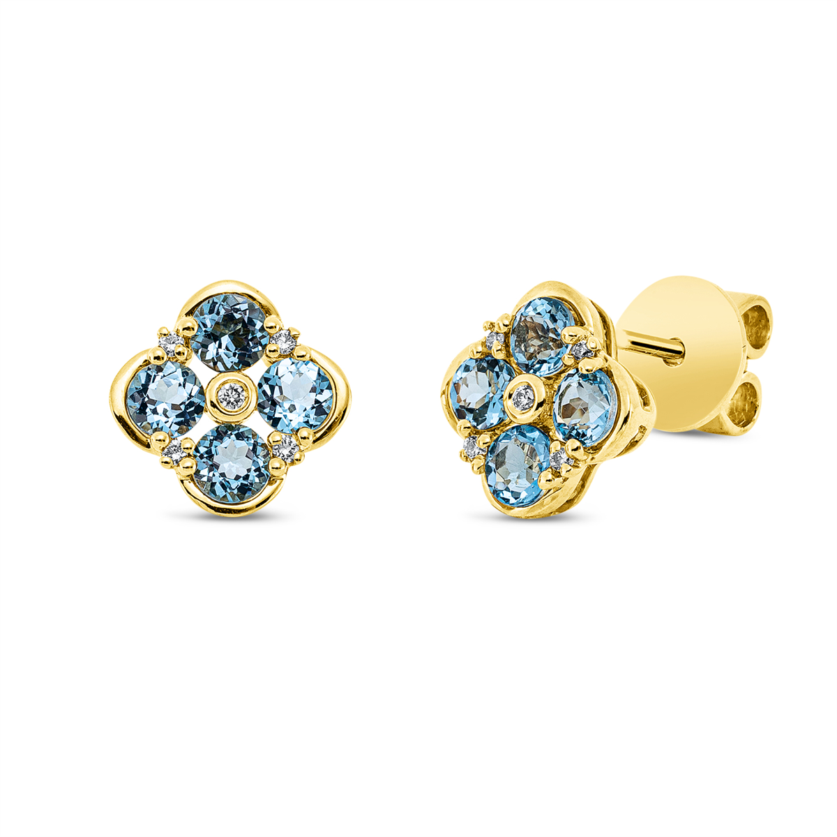 Ohrstecker 18 kt GG, 10 Brillanten 0,07 ct, TW-si, 8 Topase 1,10 ct blau, H:9,6 mm, B:9,6 mm, S:3,6 mm