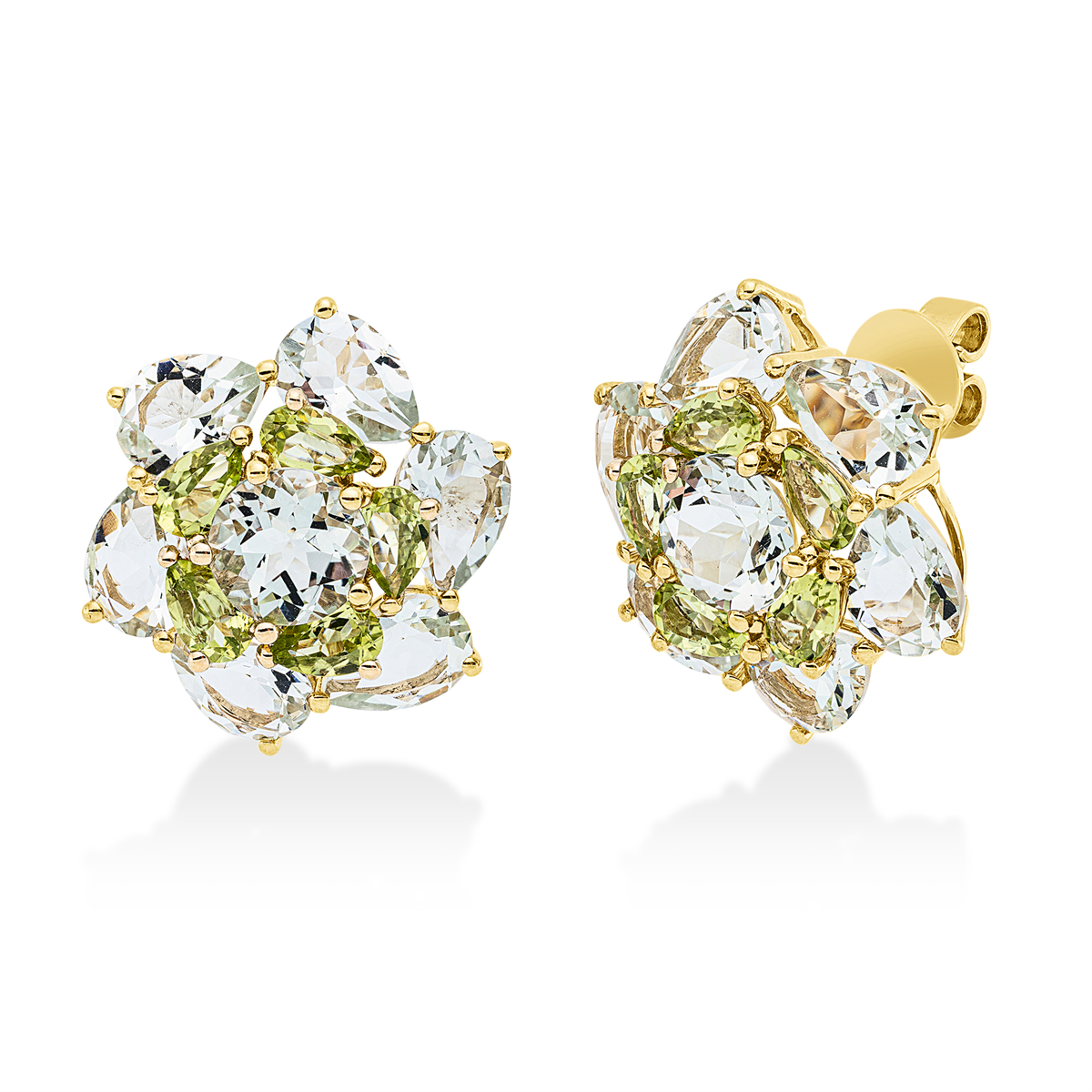 Ohrstecker 18 kt GG, 12 Amethyste 7,80 ct grün, 2 Amethyste 2,50 ct grün, 10 Peridot 2,10 ct grün