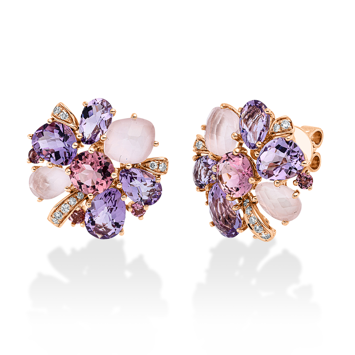 Ohrstecker 18 kt RG, 18 Brillanten 0,11 ct, TW-si, 4 Rosenquarz 2,50 ct rosa, 8 Amethyste 4,20 ct lila, 8 Turmalin 1,90 ct pink, H:17,5 mm, B:17,8 mm, S:6,9 mm