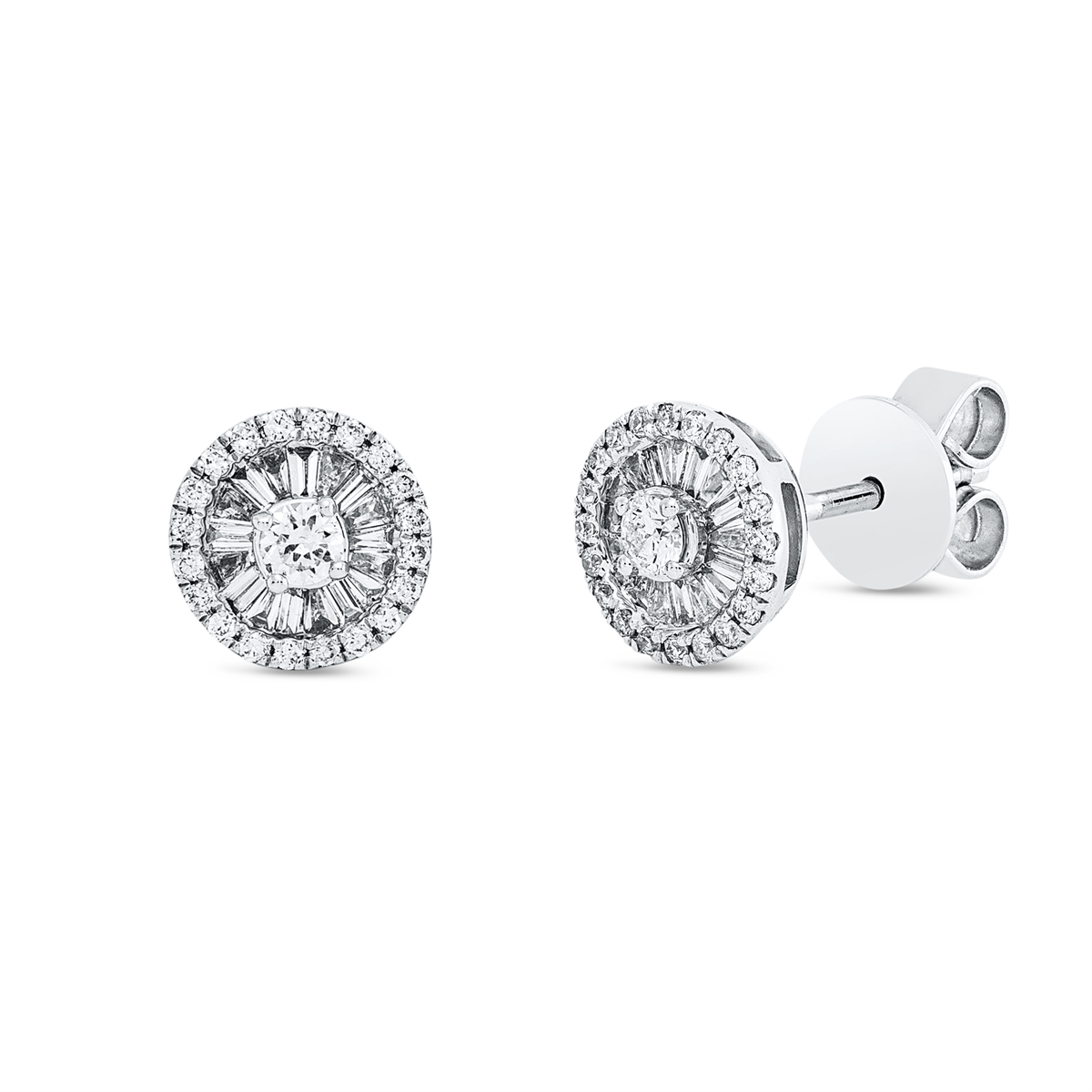 Ohrstecker 18 kt WG, 31 Trapeze 0,22 ct, F-si, 42 Brillanten 0,21 ct, F-si, H:7,2 mm, B:7,2 mm, S:3,9 mm