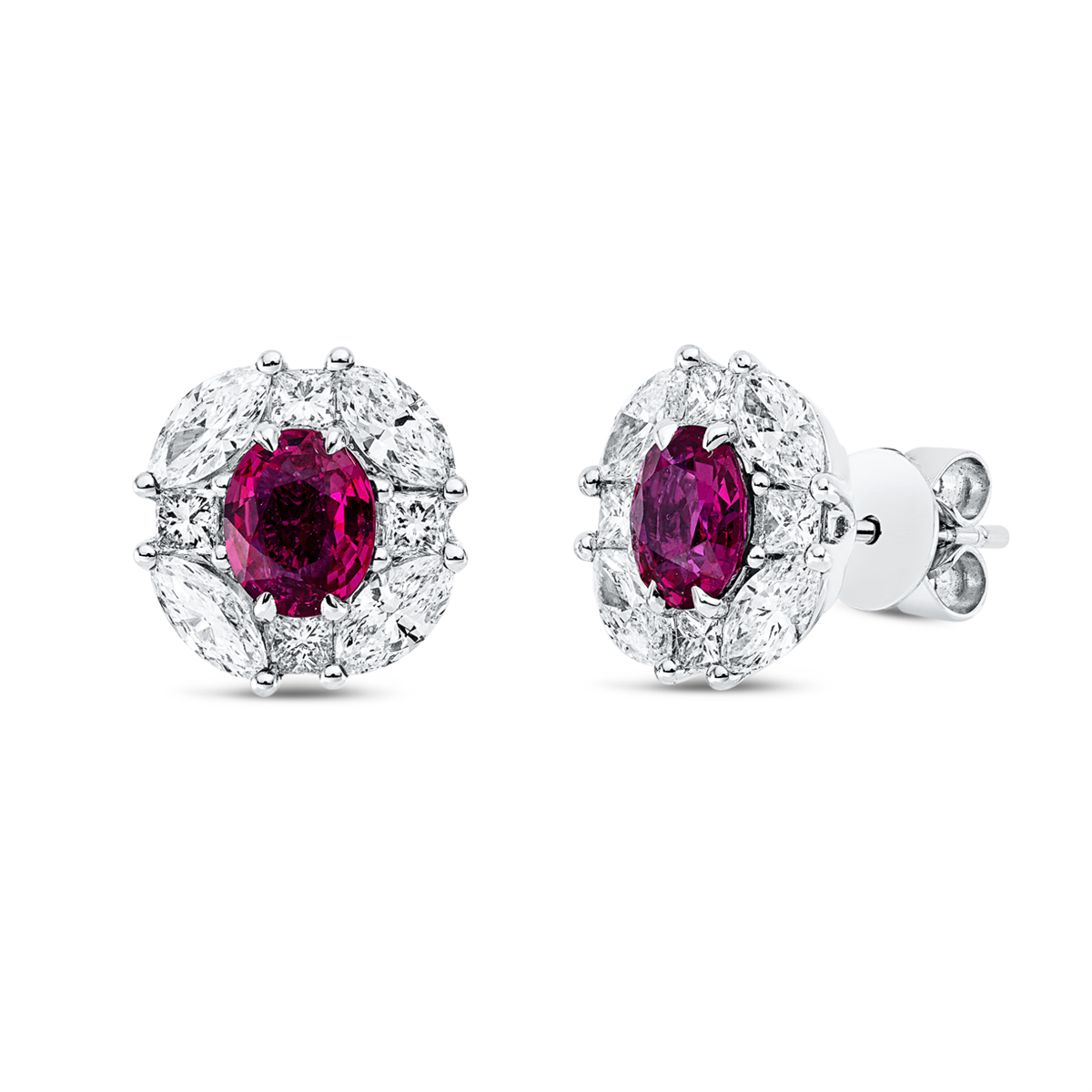 Ohrstecker 18 kt WG, 8 Navette 1,23 ct, F-vsi, 8 Princ. 0,42 ct, F-vsi, 2 Rubine 1,44 ct rot