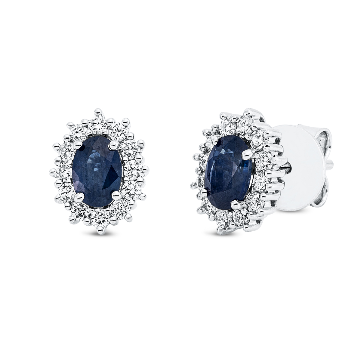 Ohrstecker 18 kt WG, 24 Brillanten 0,40 ct, TW-si, 2 Saphire 1,08 ct blau, H:10,3 mm, B:8,0 mm, S:4,6 mm