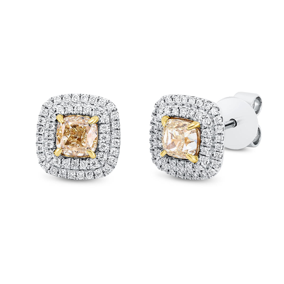 Ohrstecker 18 kt WG+GG, 96 Brillanten 0,24 ct, TW-si, 2 Cushion 0,99 ct, gelb