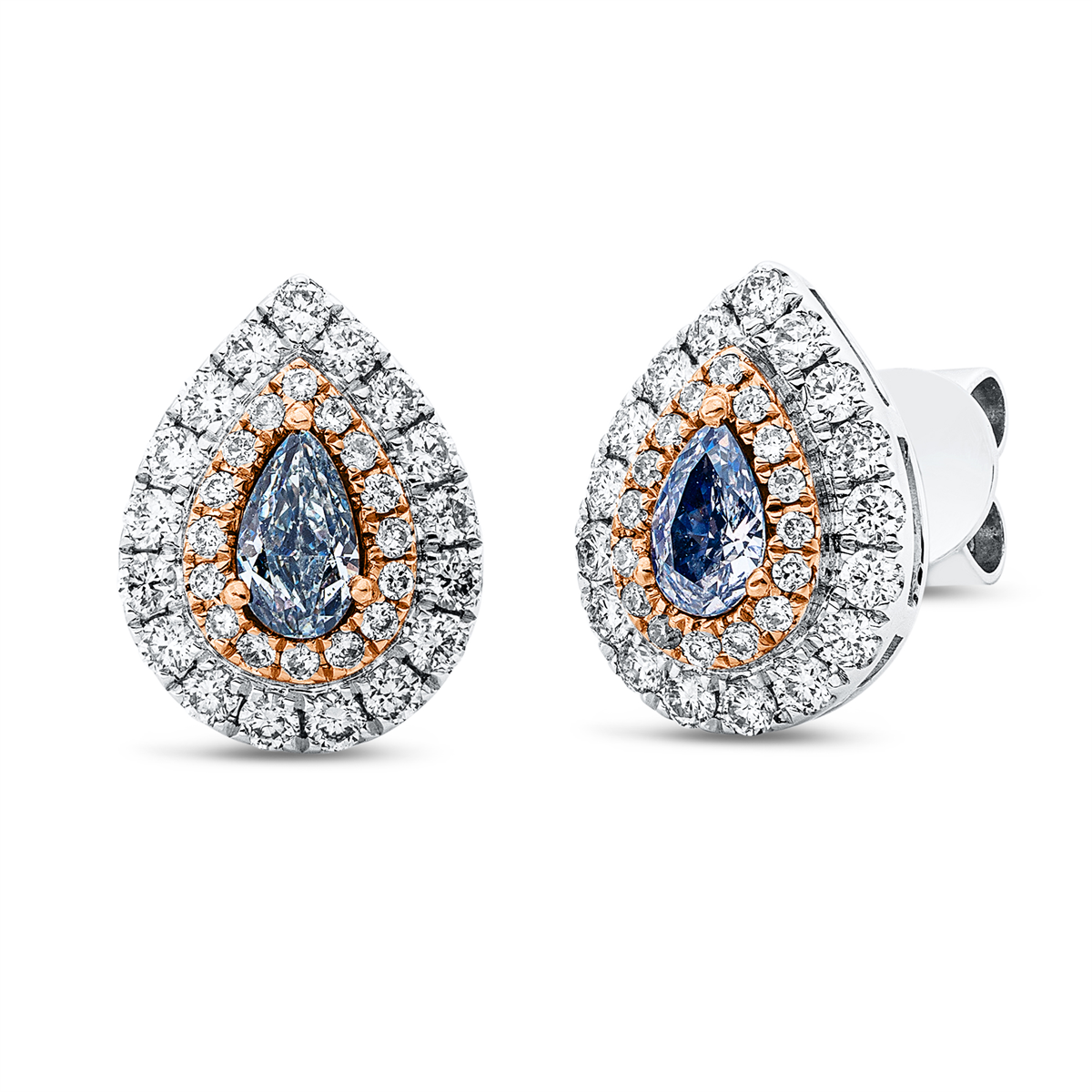 Ohrstecker 18 kt WG+RG, 2 Tropfen 0,27 ct, blau-vsi, 66 Brillanten 0,38 ct, TW-si, H:10,0 mm, B:7,8 mm, S:4,6 mm