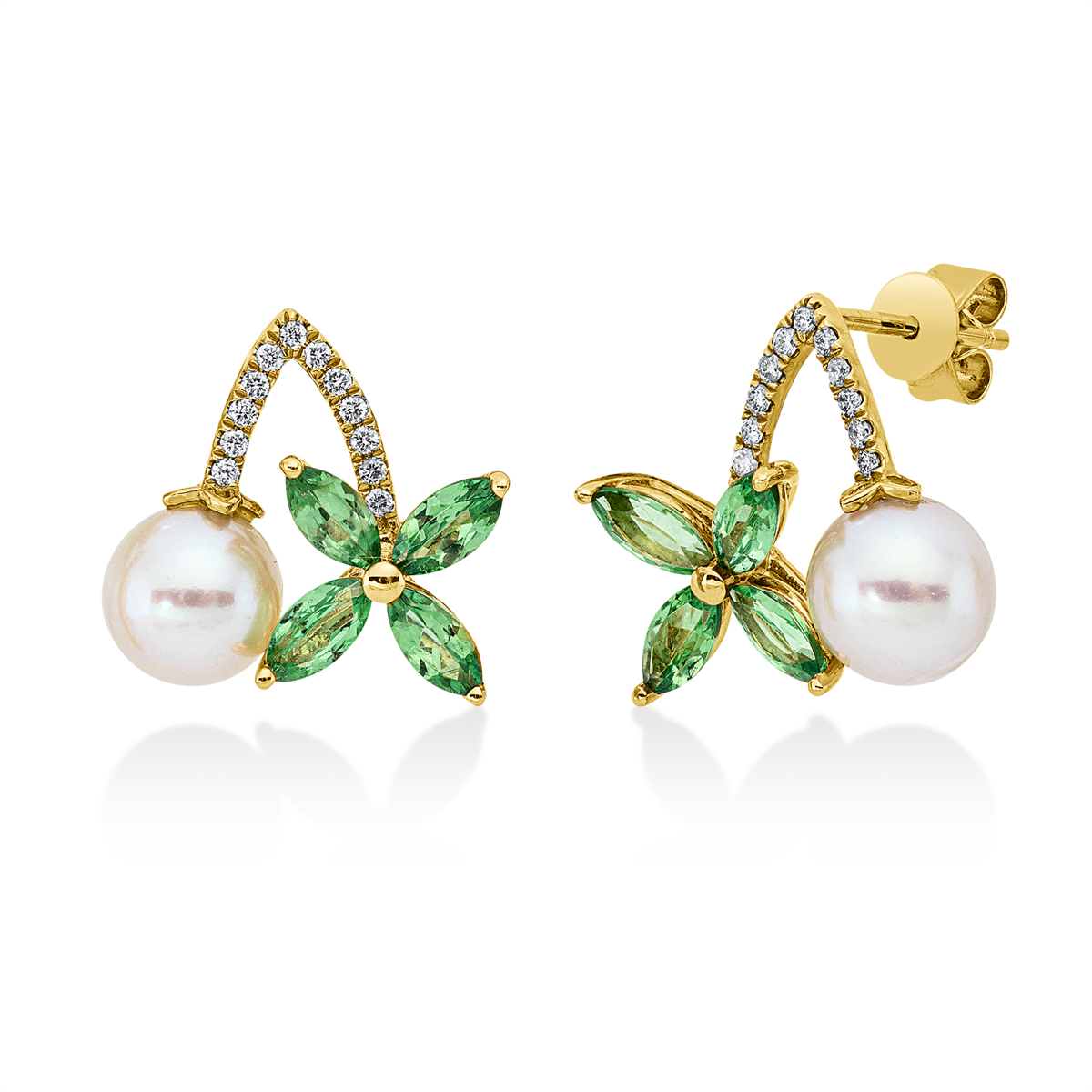 Ohrstecker 18 kt GG, 24 Brillanten 0,12 ct, TW-si, 8 Tsavorith 1,34 ct grün, 2 SW weiß 6,5 mm, H:14,1 mm, B:14,5 mm, S:6,7 mm