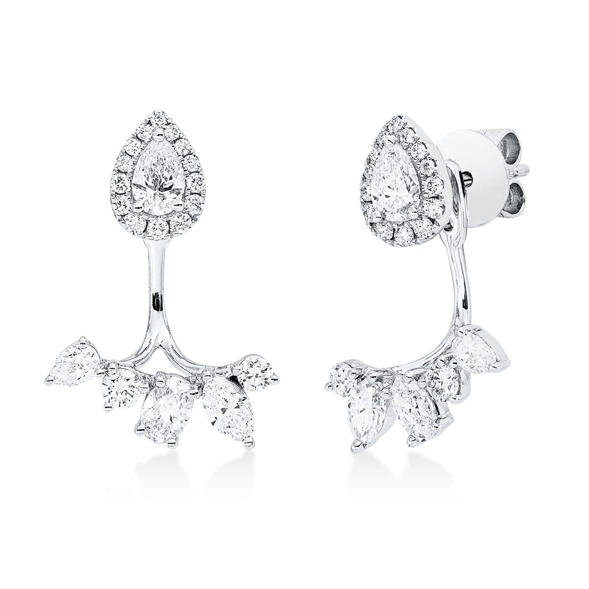 Ohrstecker 18 kt WG, 2 Oval 0,37 ct, TW-vsi, 2 Navette 0,32 ct, TW-si, 4 Tropfen 0,65 ct, TW-si, 32 Brillanten 0,43 ct, TW-si
