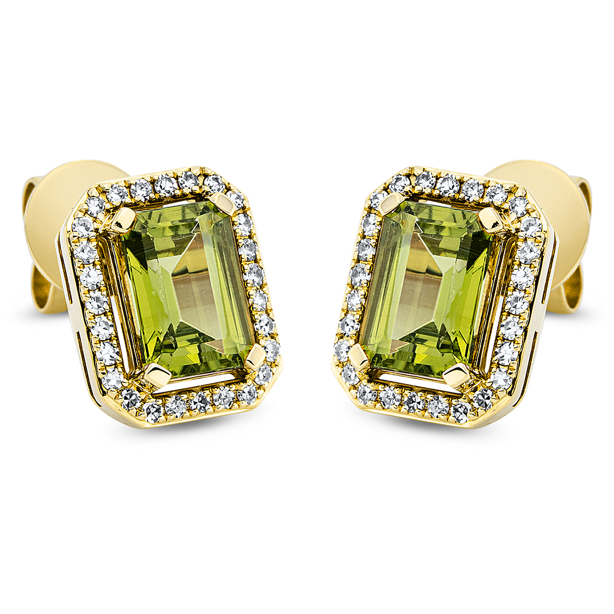Ohrstecker 4er-Krappe 18 kt GG, 54 Diamanten 0,19 ct, TW-si, 2 Peridot 2,07 ct grün, H:10,2 mm, B:8,2 mm