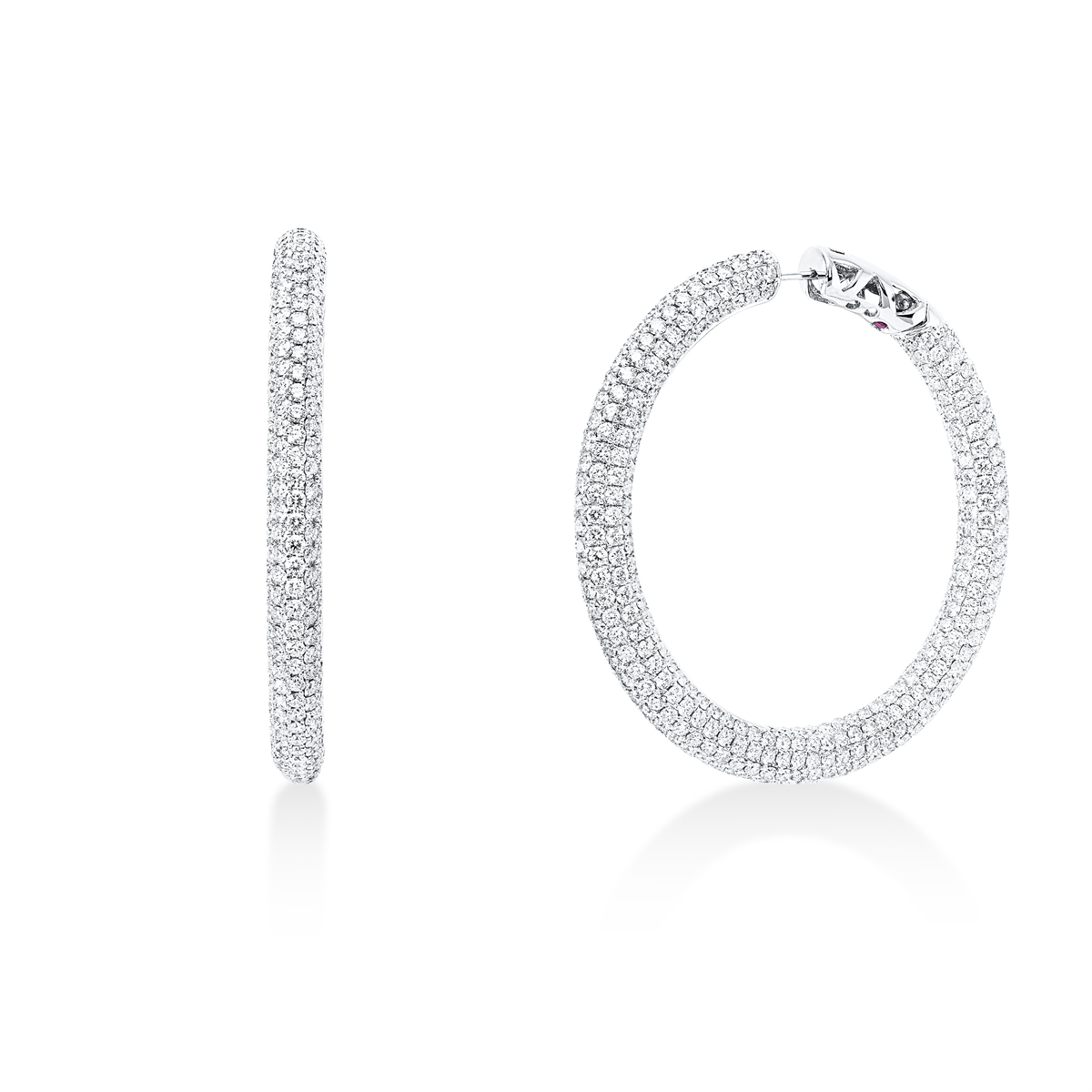 Creolen 18 kt GG, 866 Brillanten 13,43 ct, TW-vsi, 2 Rubine 0,02 ct rot, H:49,0 mm, B:49,0 mm, S:4,7 mm